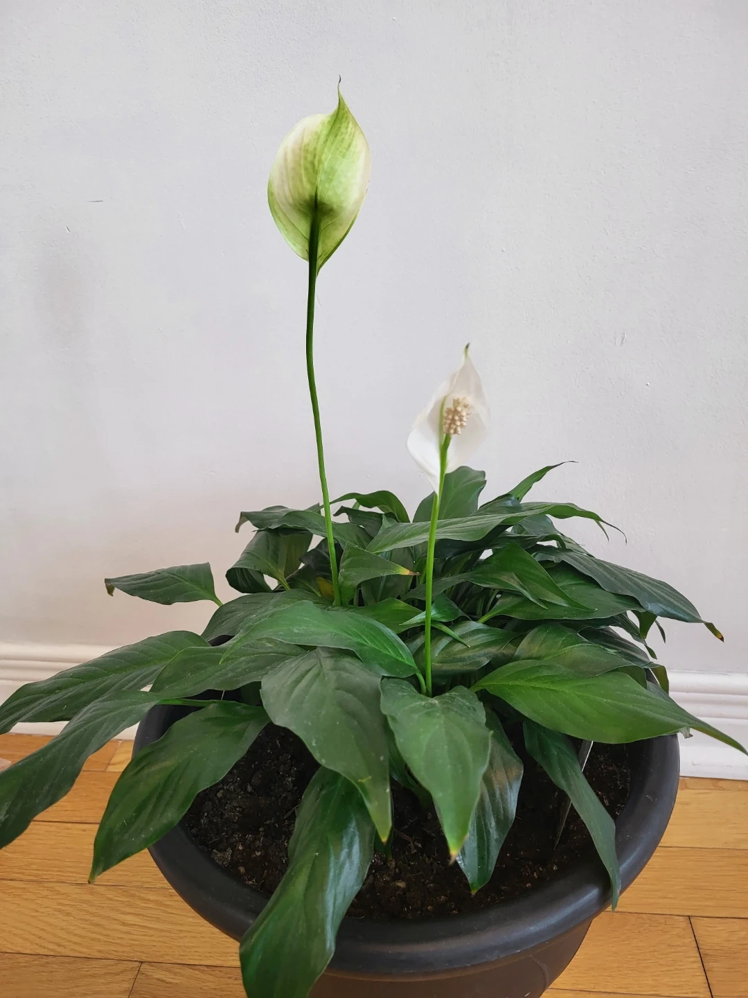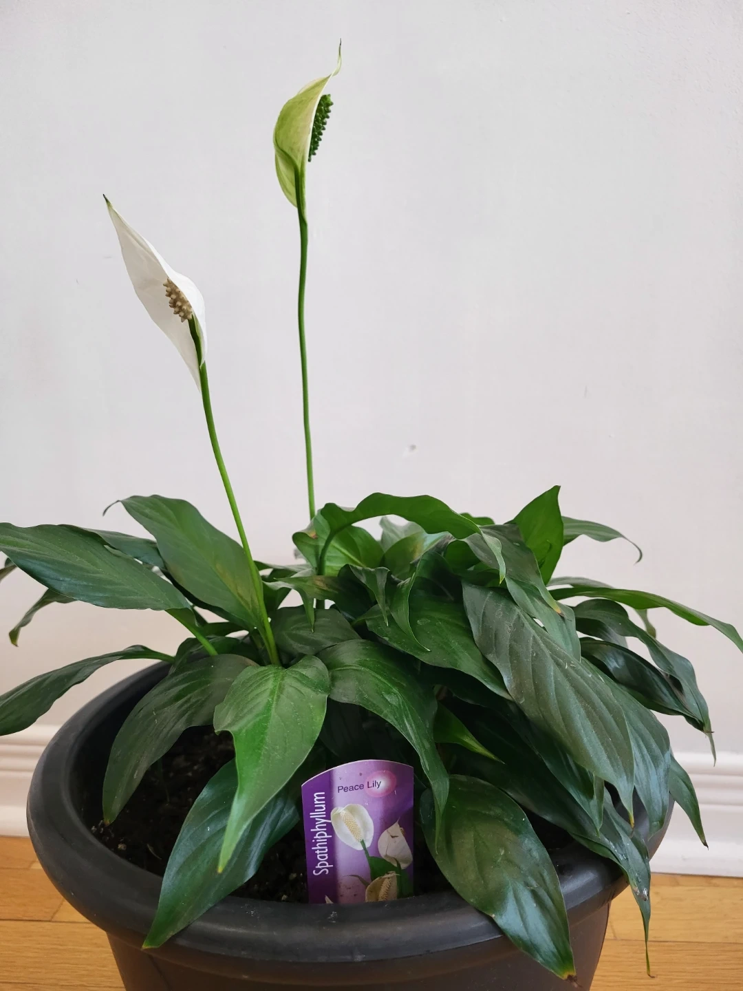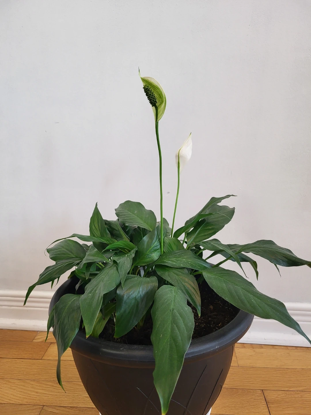Peace Lily plant in a black pot. It's known for its elegant white flowers and lush green foliage. This plant is great for adding a touch of nature to indoor spaces. It prefers low to medium light conditions.