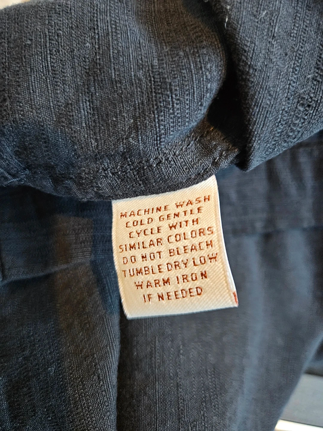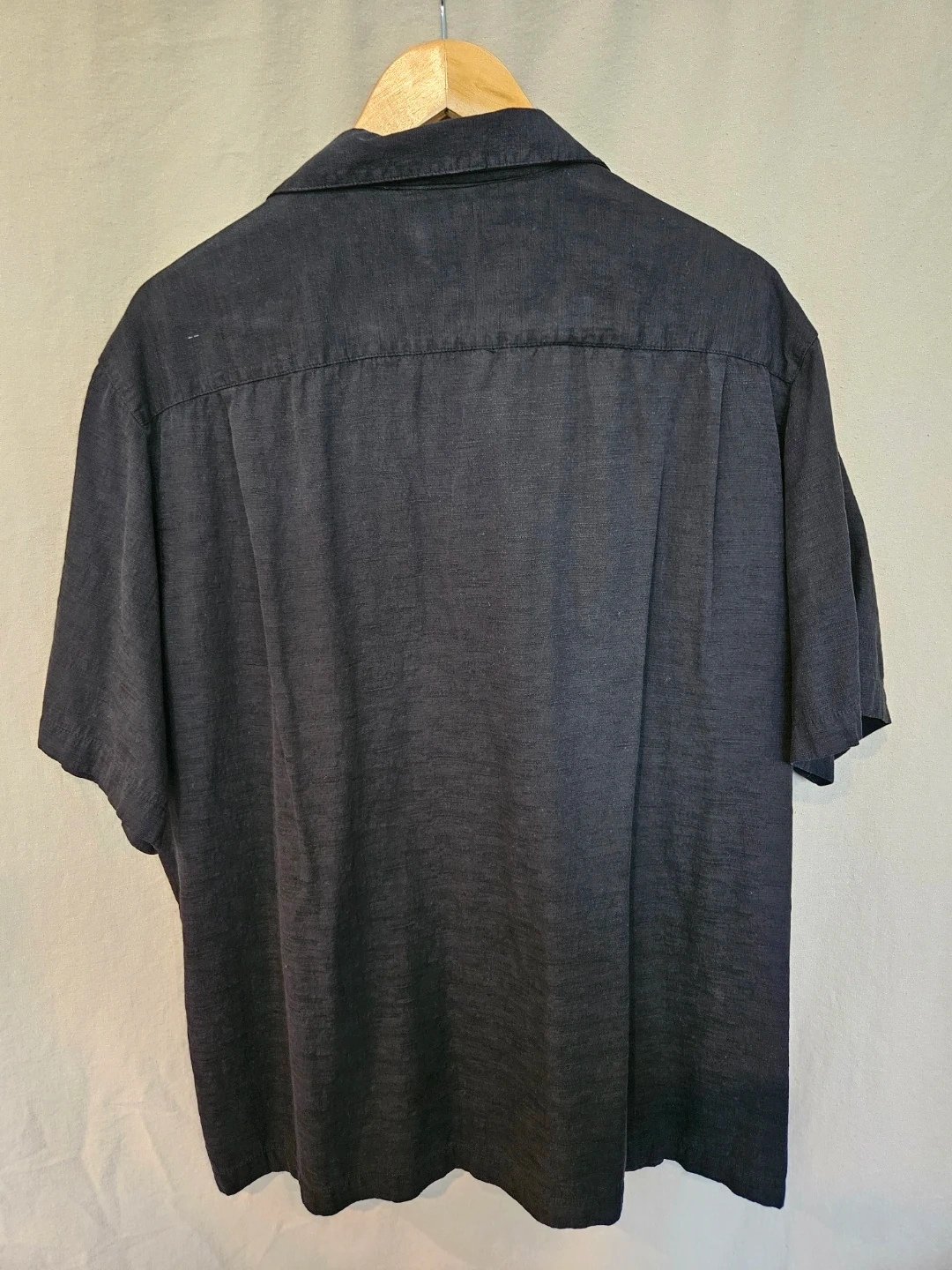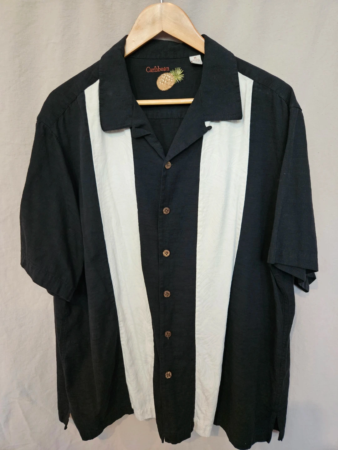 This is a black short-sleeve Caribbean shirt with a pineapple embroidery detail. It's a size XL, made of 75% silk and 25% cotton. Machine wash cold gentle cycle with similar colors.