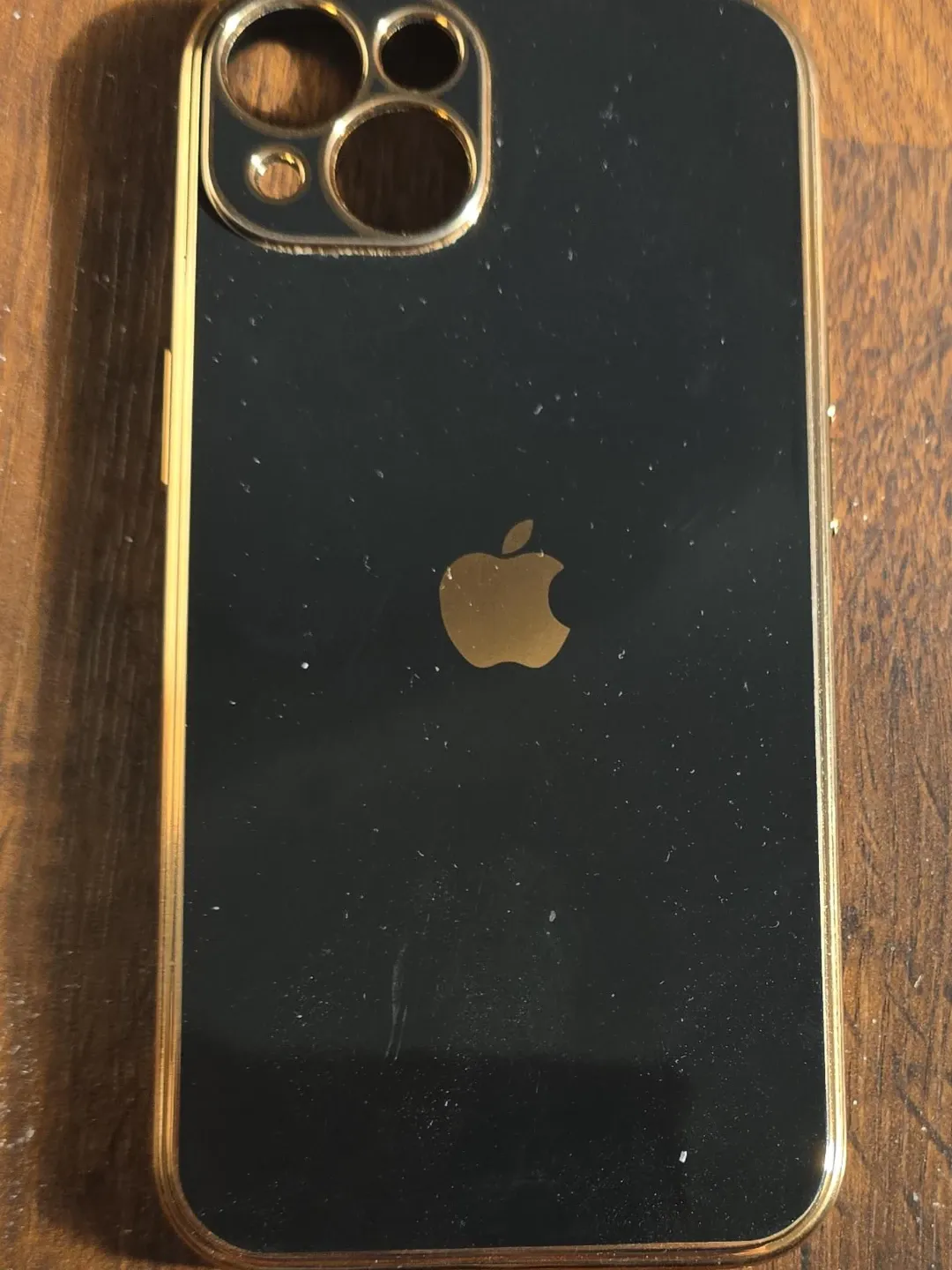 This is a black iPhone case with a shiny gold trim. It's designed to protect your phone and add a touch of style. The case has cutouts for the camera and buttons.