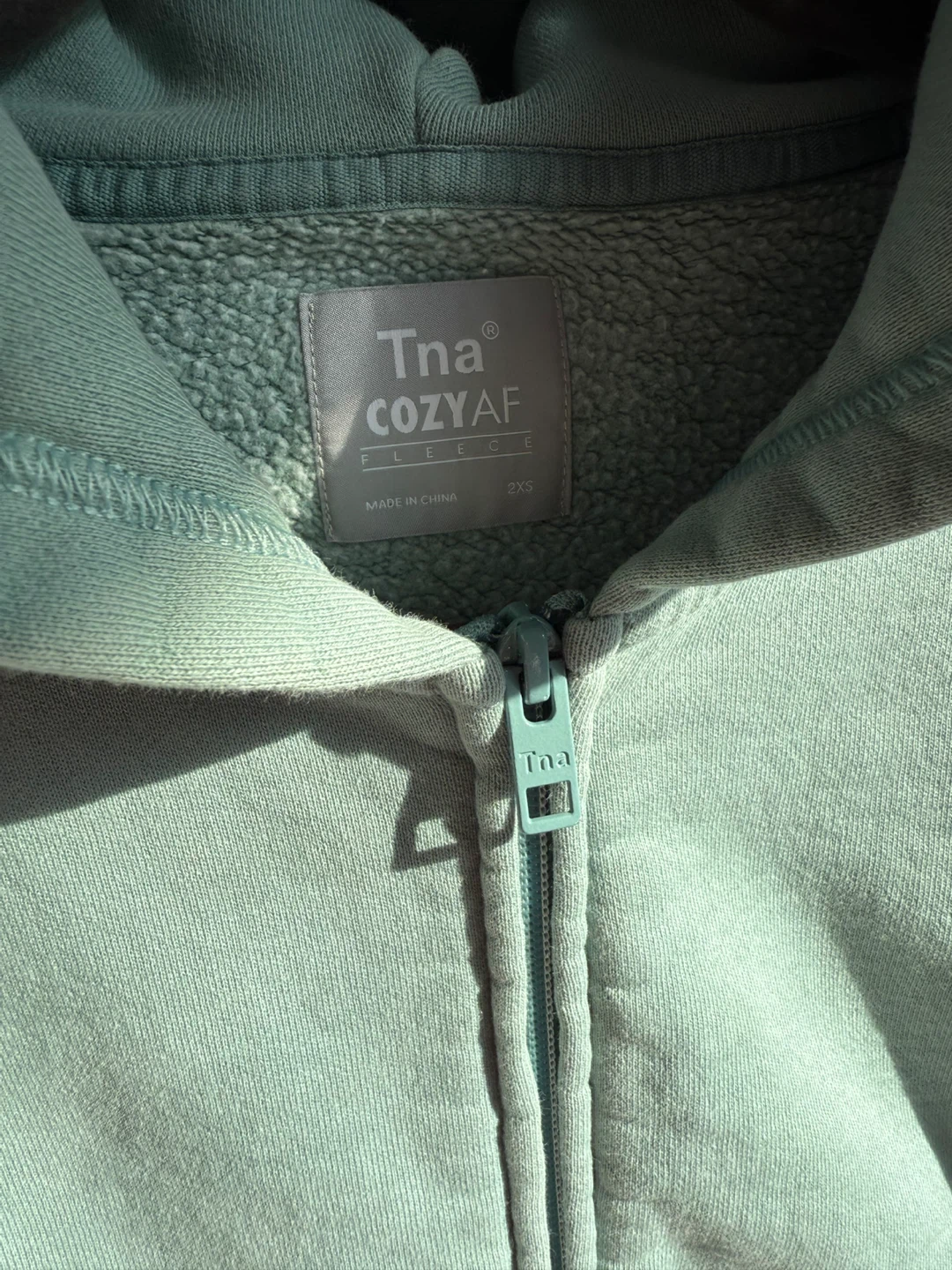 Selling a Tna CozyAF fleece zip-up hoodie in size 2XS! It's a lovely light green colour and in great condition. Perfect for layering or just lounging around in something comfy!
