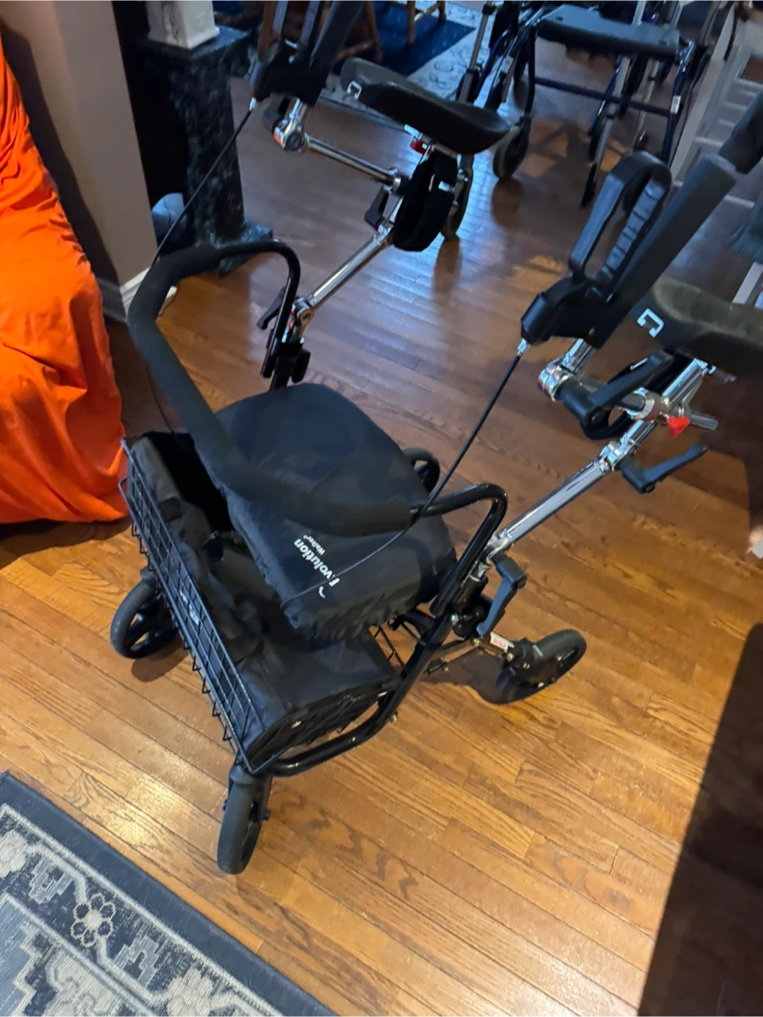 This black Evolution rolling walker is designed for mobility assistance. It features a seat and a basket for carrying items. It folds for convenient storage and transport.