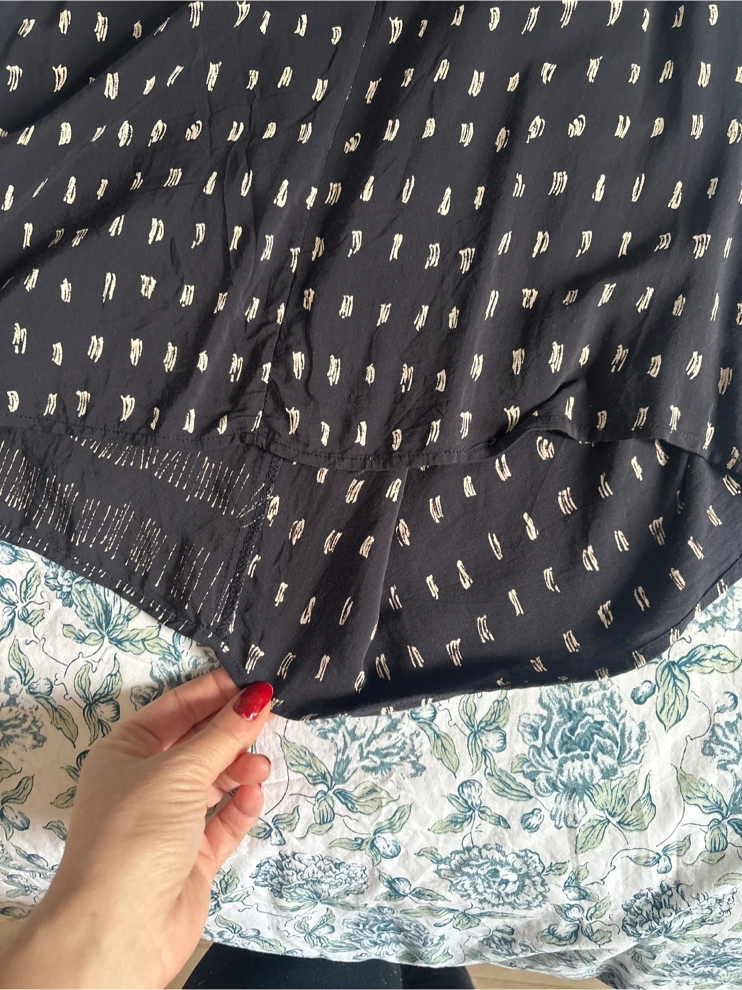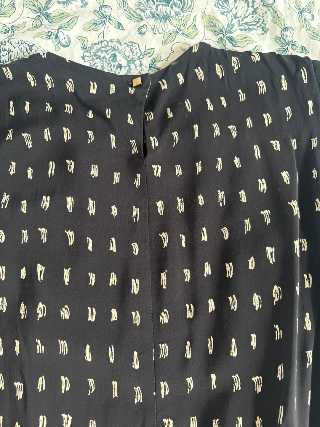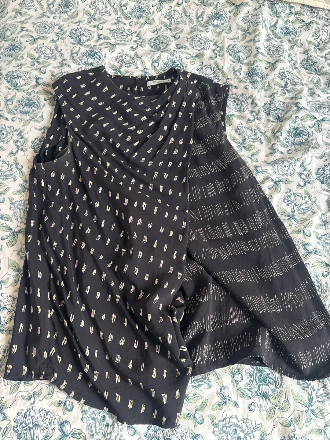 A chic sleeveless top from MM. La Fleur in black with a subtle cream dash pattern. It's a size medium. The fabric drapes nicely, making it a versatile, sophisticated piece.