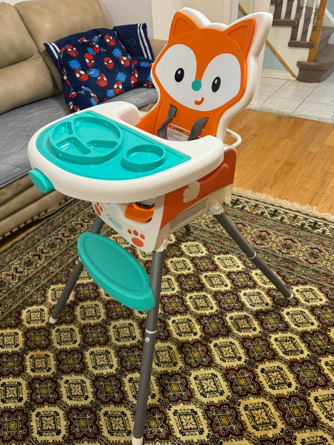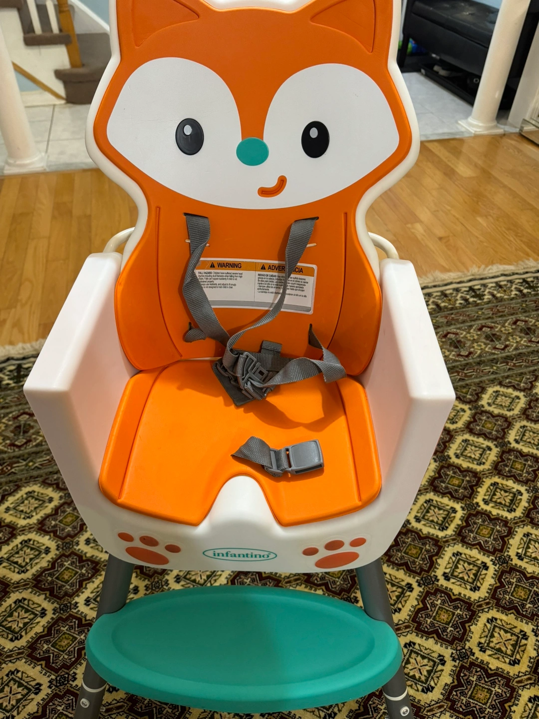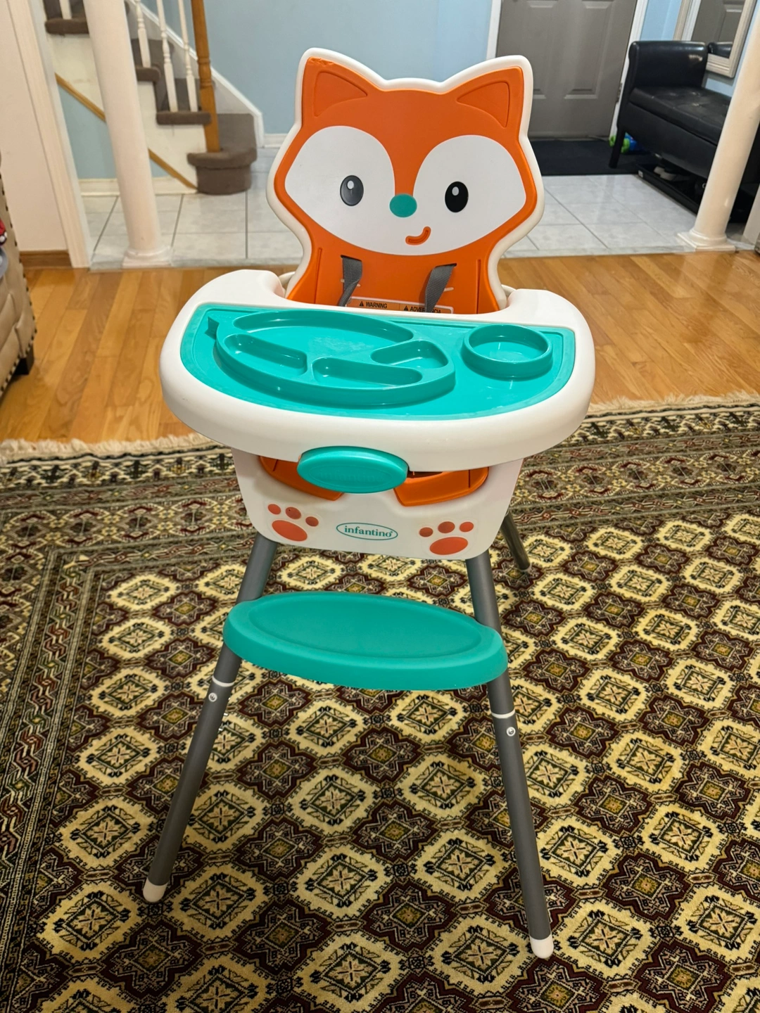 This high chair features a removable tray, a five-point harness and a foot rest. It is height adjustable and the seat is easy to clean. It comes with a removable tray with cup holder. The high chair is in excellent condition.