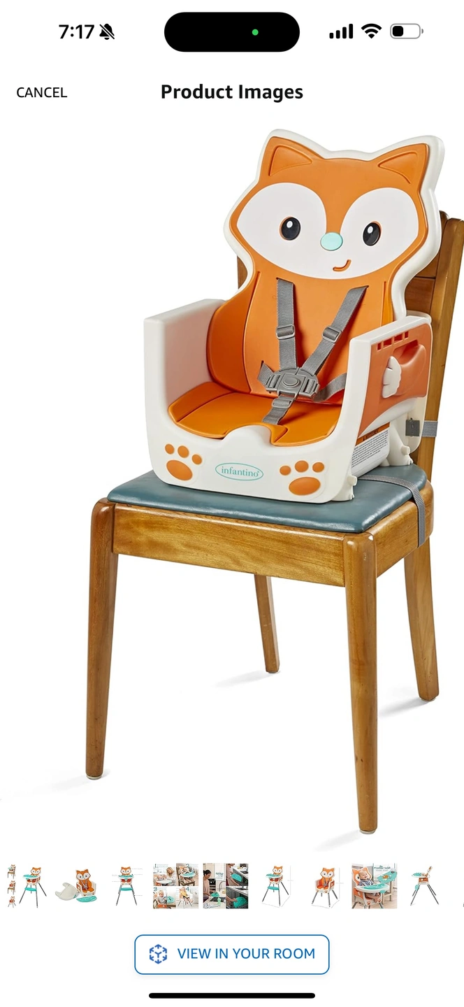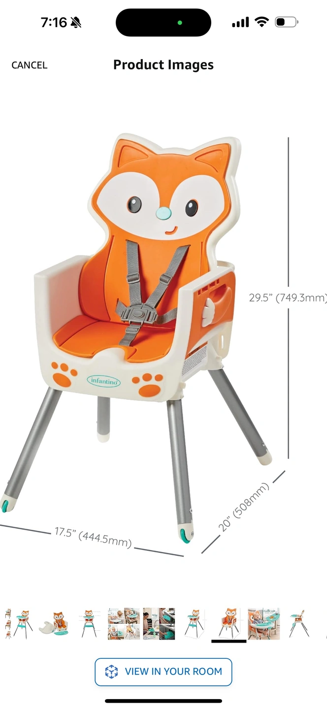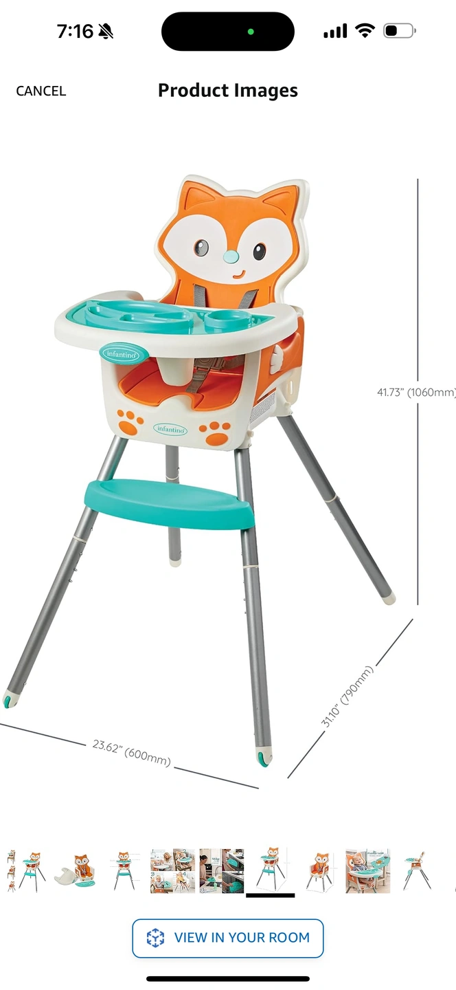 This high chair features a removable tray, a five-point harness and a foot rest. It is height adjustable and the seat is easy to clean. It comes with a removable tray with cup holder. The high chair is in excellent condition.