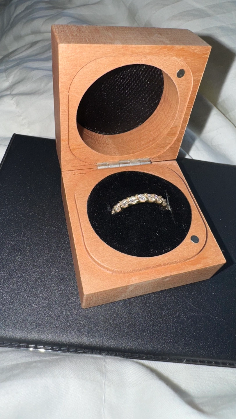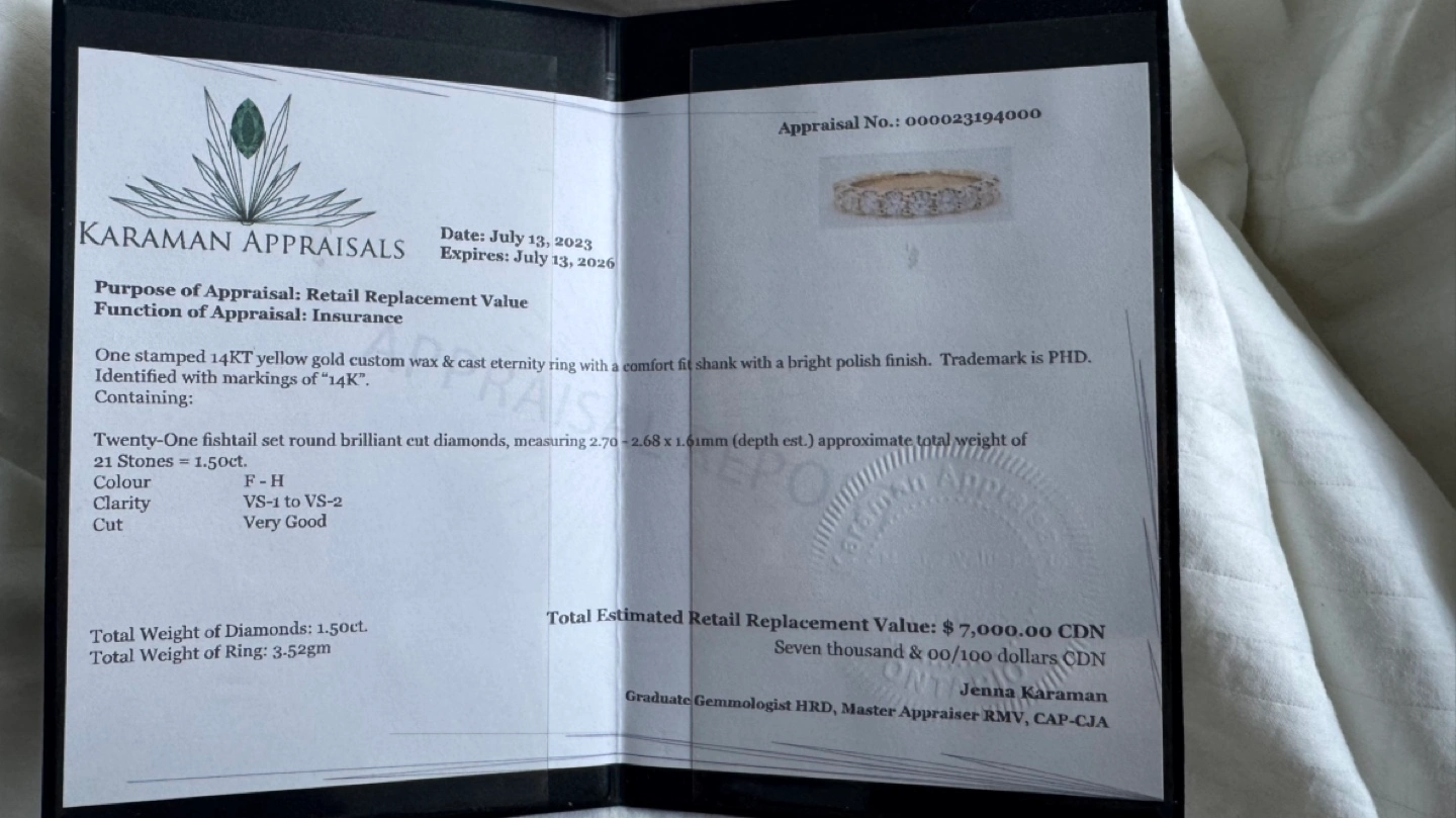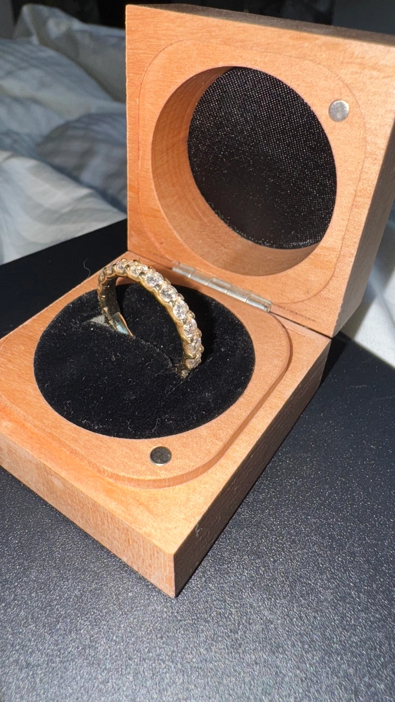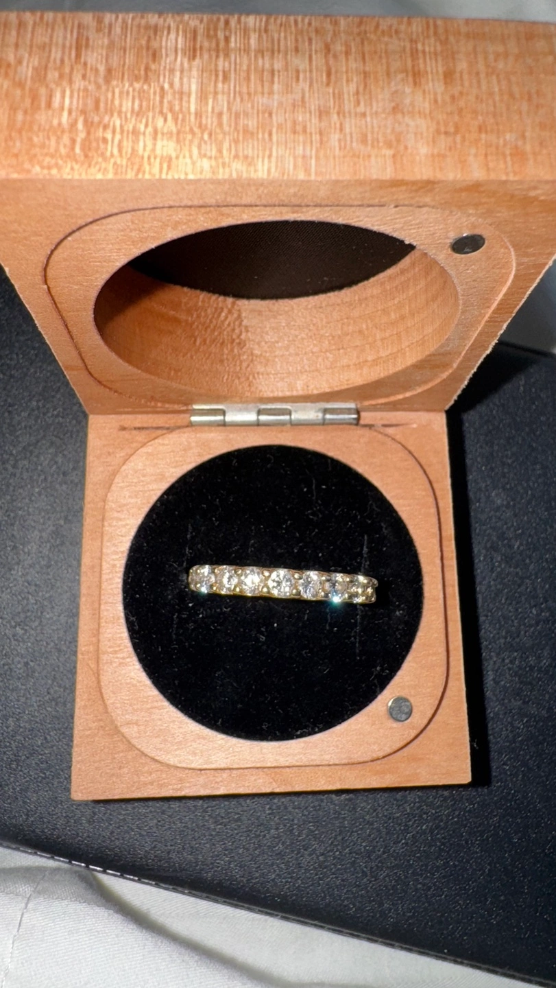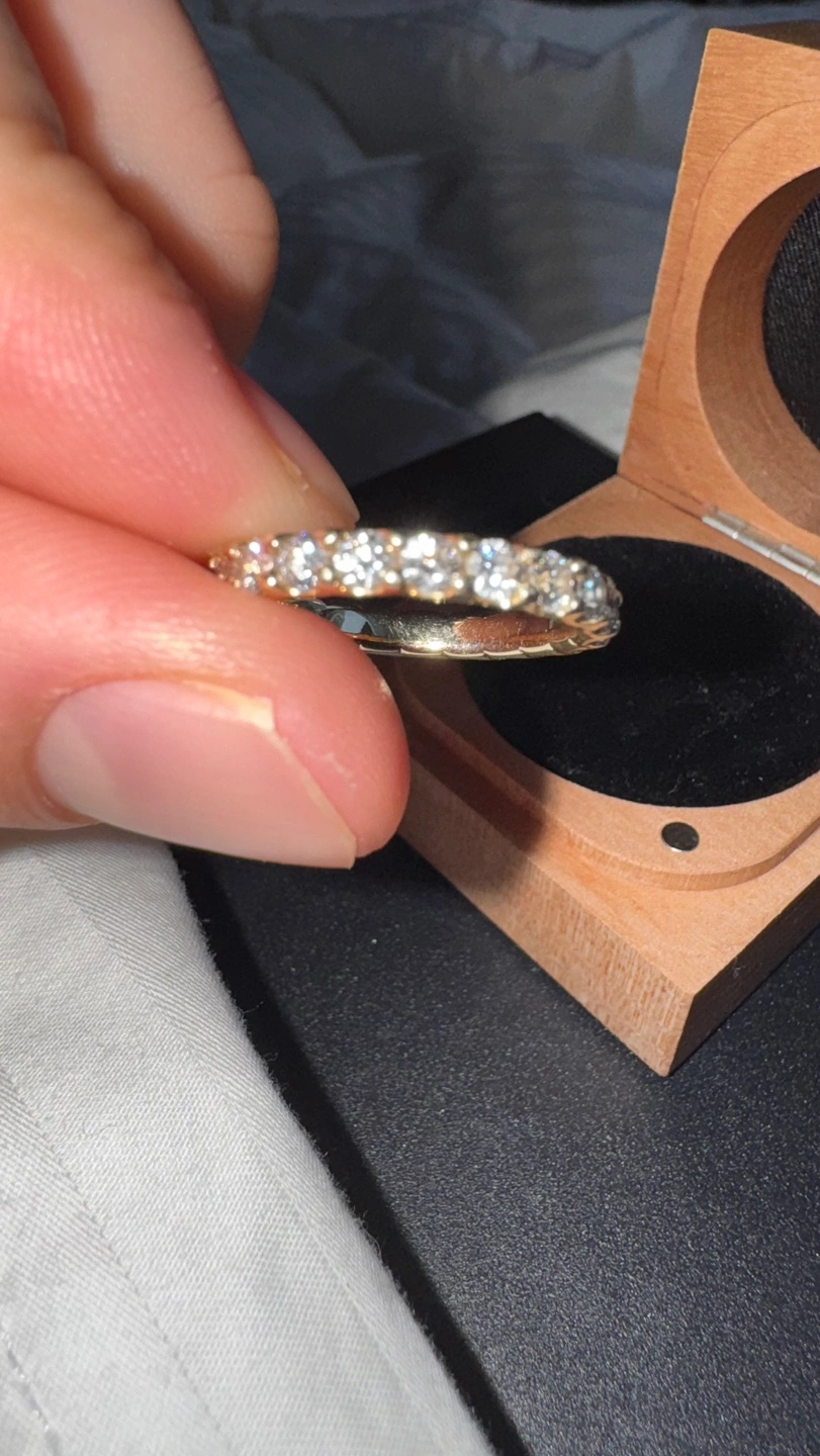 Beautiful 14K gold eternity band. Features channel-set diamonds. Comes in original wooden box.