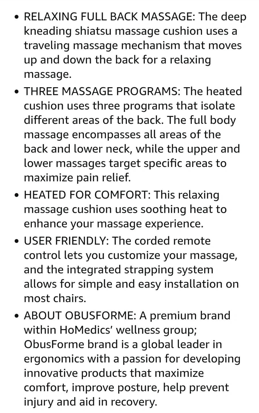 Get ready to unwind with the Obusforme deep kneading shiatsu massage cushion, designed to bring relaxation right to your chair. This cushion has three massage programs to target different areas of your back, with a user-friendly remote, it easily attaches to most chairs for the complete massage experience! Key features:
