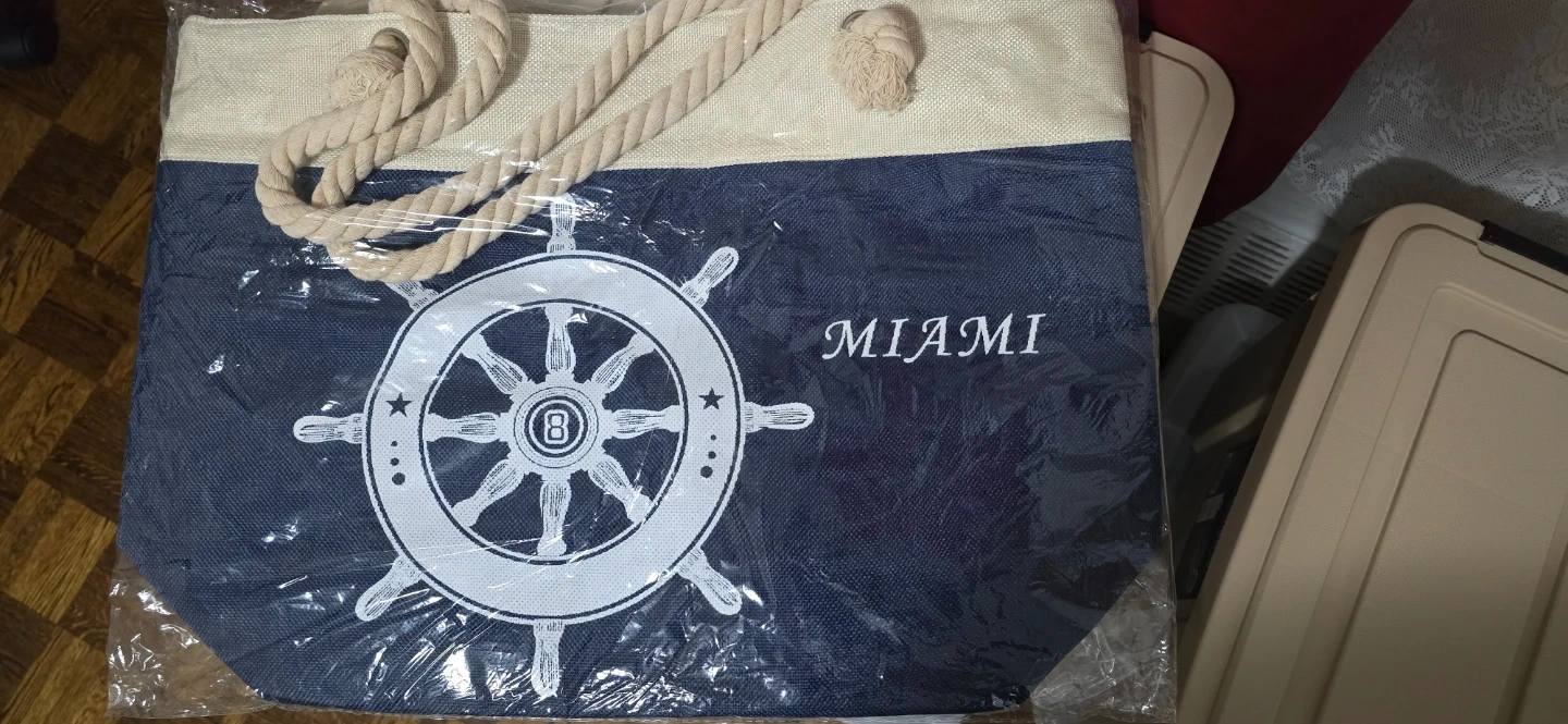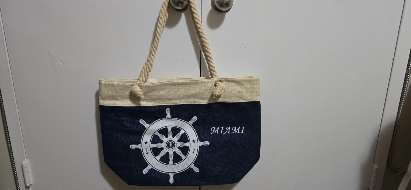Canvas tote bag with a navy blue bottom featuring a white steering wheel graphic and "MIAMI" text. It has a beige top section and thick rope handles. The interior includes a zippered pocket. Great for beach days or errands!