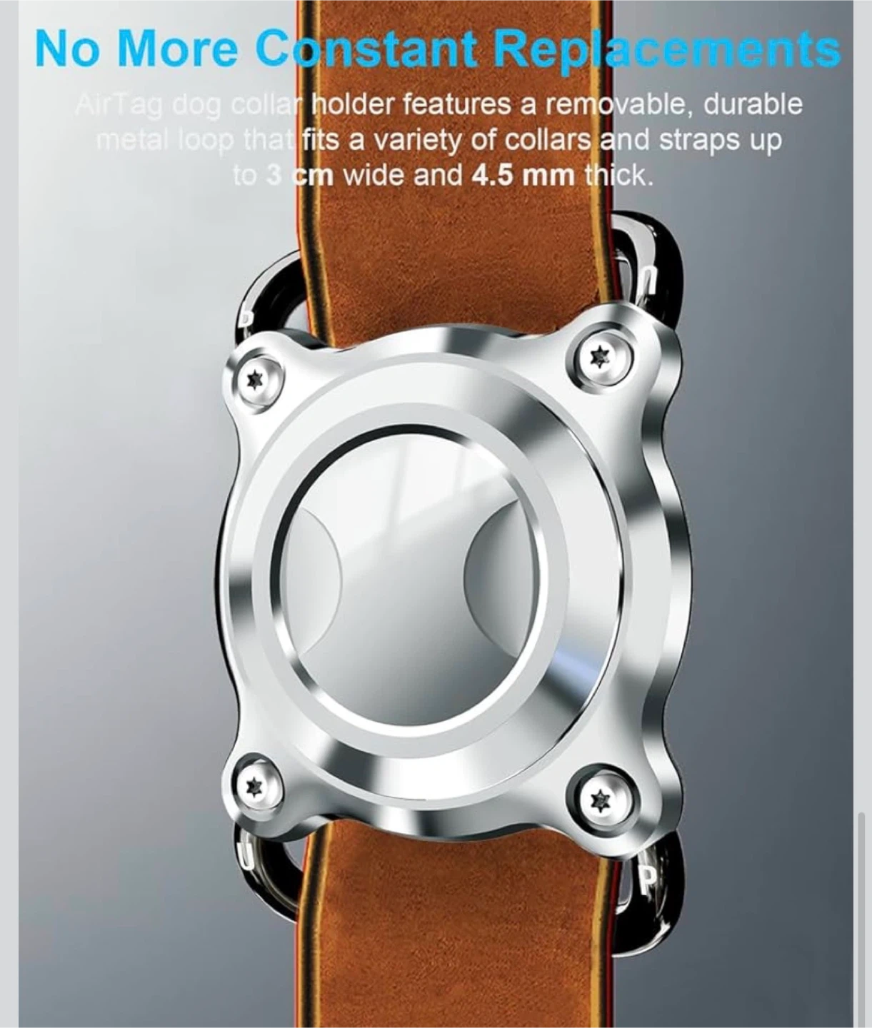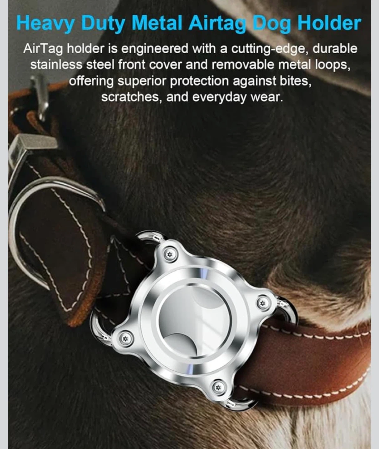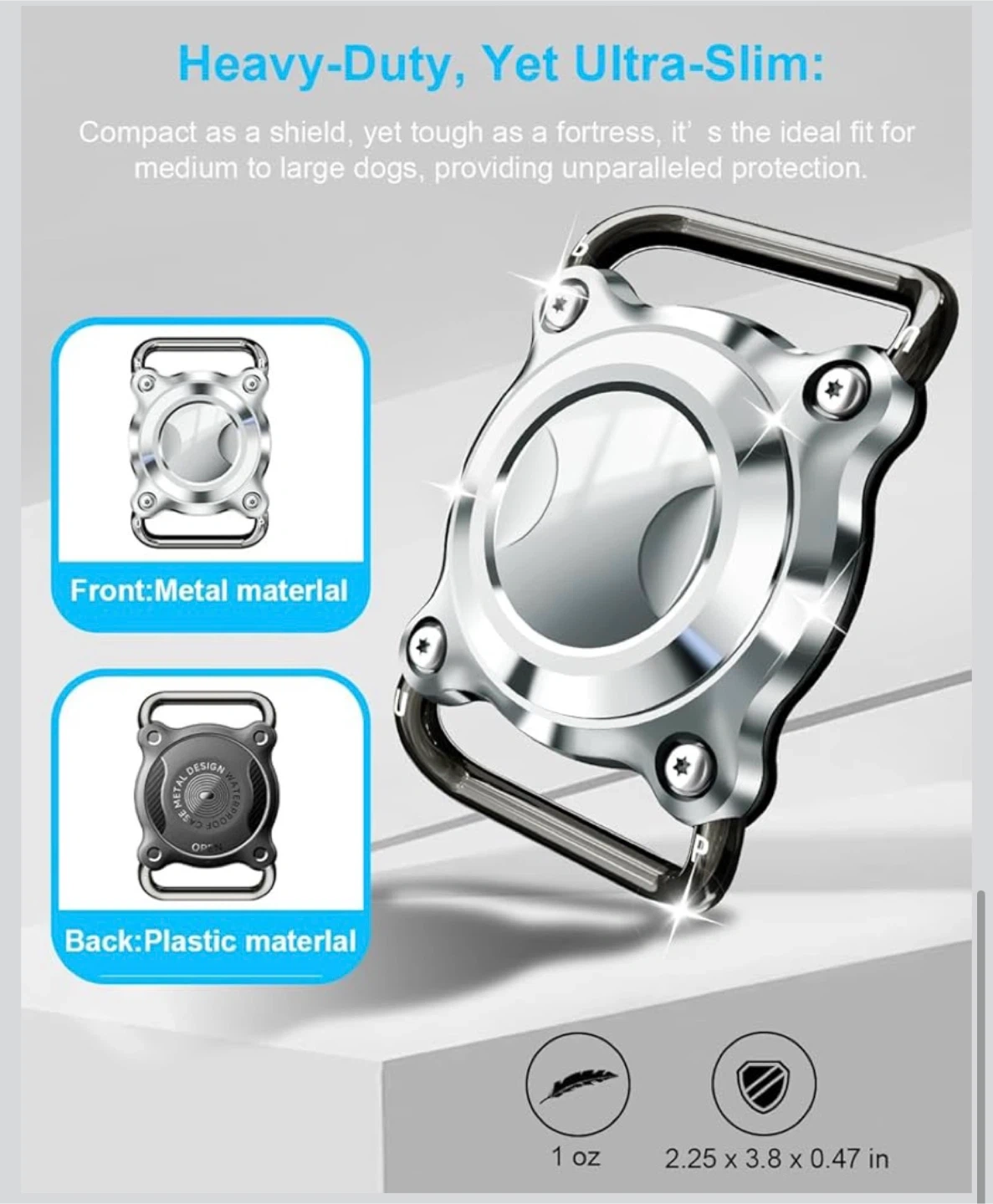This ONEONTA dog AirTag holder offers superior protection for your AirTag. It's engineered with a durable stainless steel front cover and removable metal loops. It fits collars and straps up to 3cm wide and 4.5mm thick.