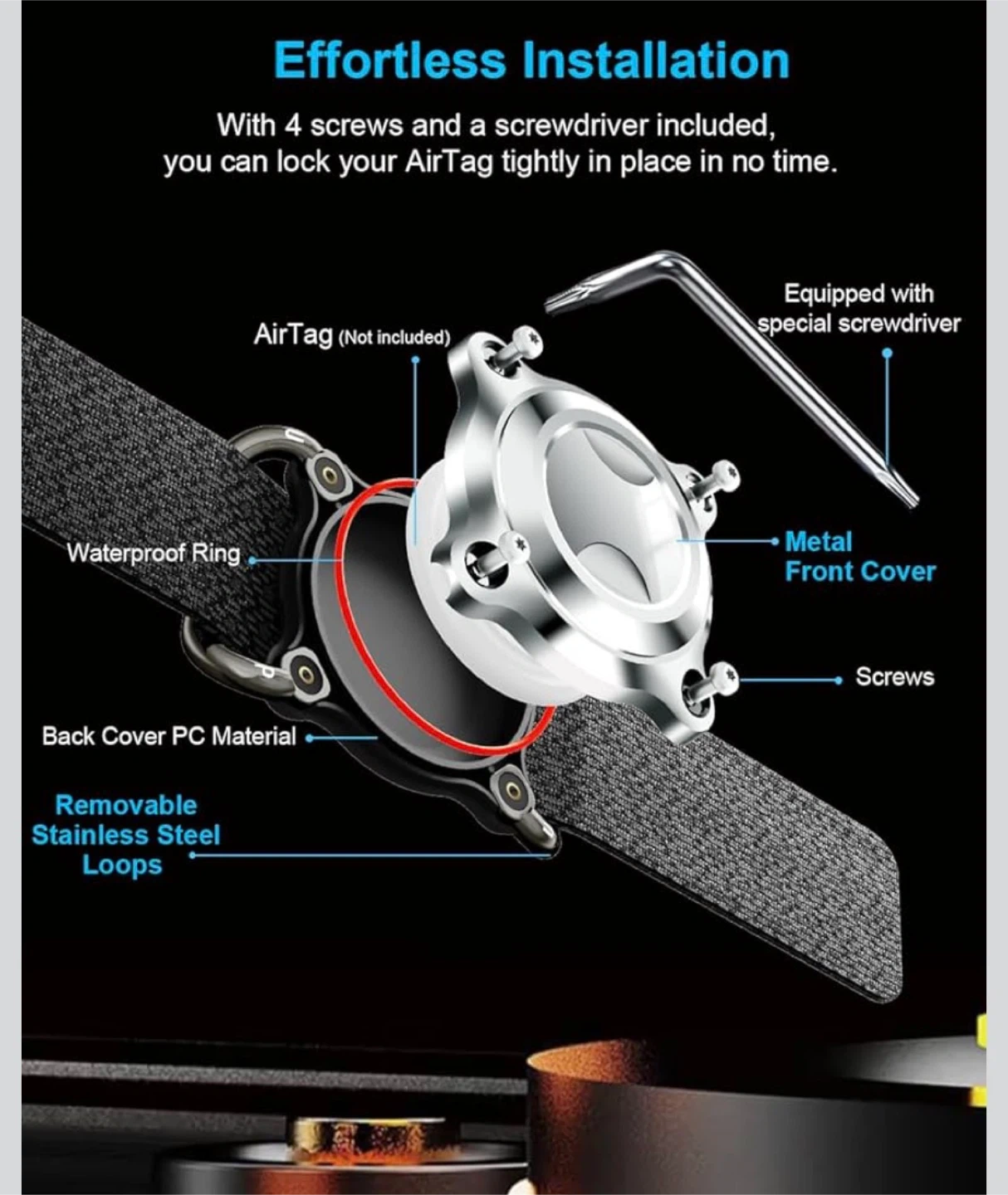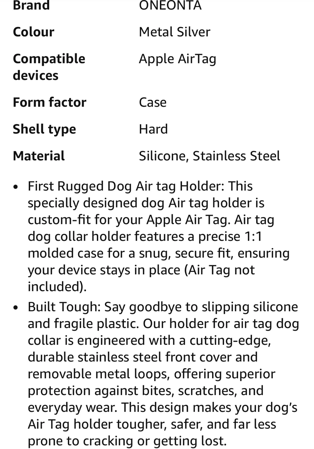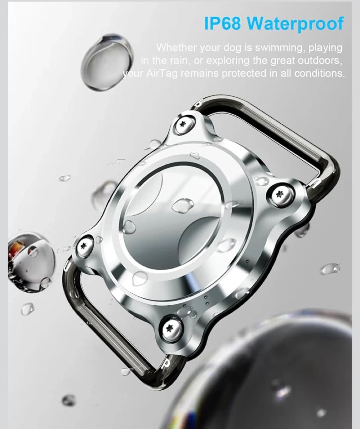 This ONEONTA dog AirTag holder offers superior protection for your AirTag. It's engineered with a durable stainless steel front cover and removable metal loops. It fits collars and straps up to 3cm wide and 4.5mm thick.