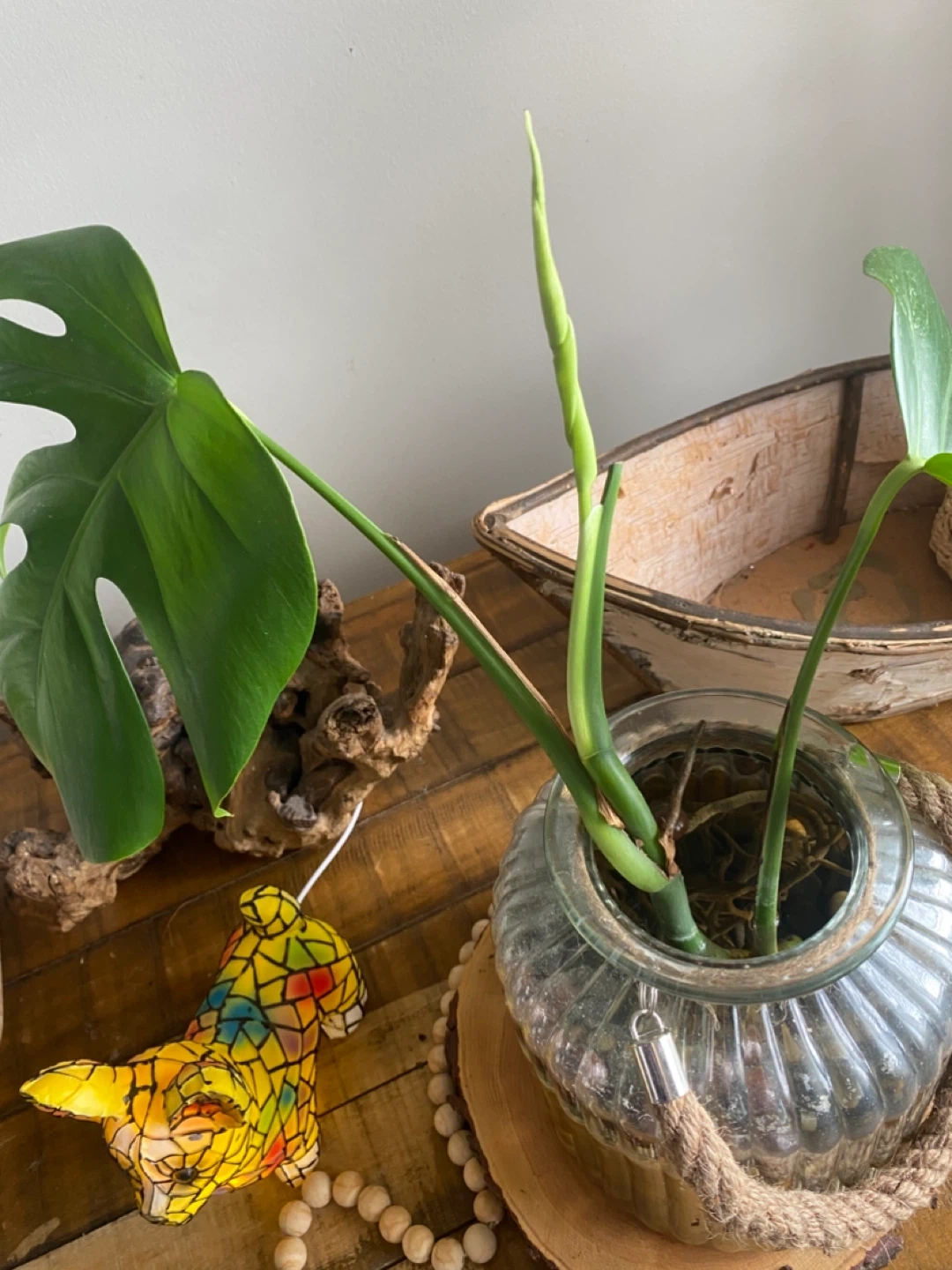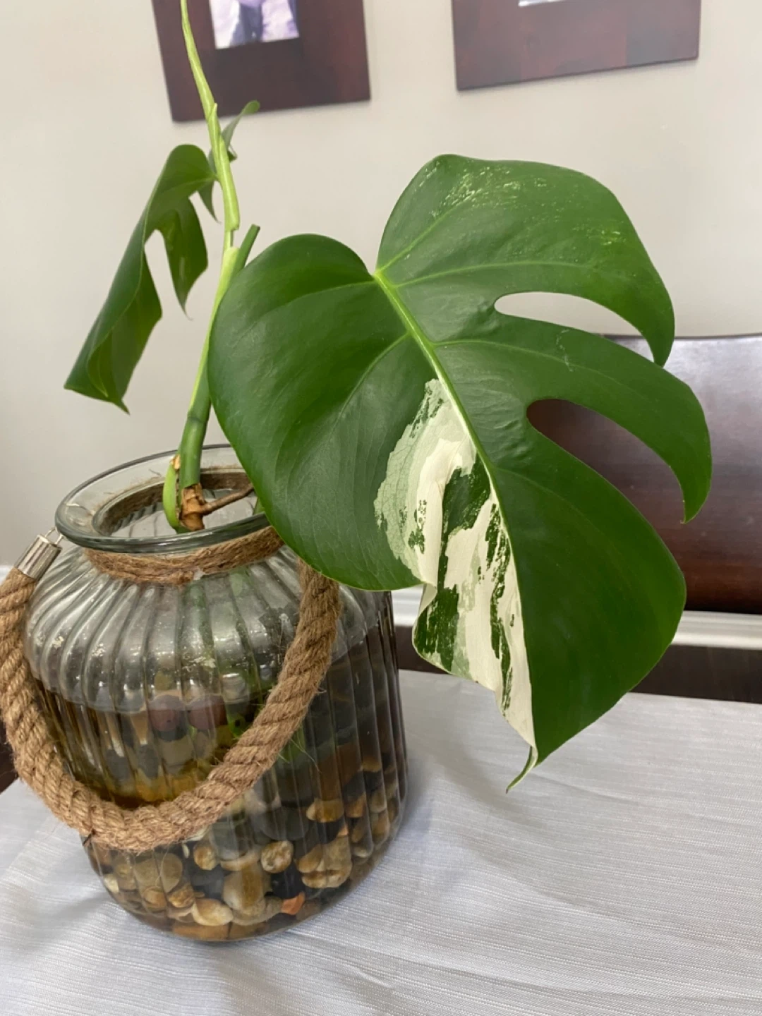 A healthy cutting of a variegated Monstera Deliciosa. It's currently rooted in water and showing new growth! The striking white and green variegation makes this a beautiful addition to any plant collection. This cuttings has numerous amounts of roots growing hydroponically. It was cut off top of the Mom plant 5 months ago and it flourishing with a new leaf unraveling. Thats why these plants are so popular because every leaf has it own unique markings. The two main leafs are adults, so they will push out two more leafs by Spring. Highly variegated with green and white accents….absolutely stunning! It's in a decorative glass vase with stones and a rope accent. Totally up the you, if you want to transplant into soil. No soil, no gnats in the spring!! All you have to do is add fresh water and place this beauty in front of a bright window. There’s nothing more majestic than an albo monstera!!❤️❤️