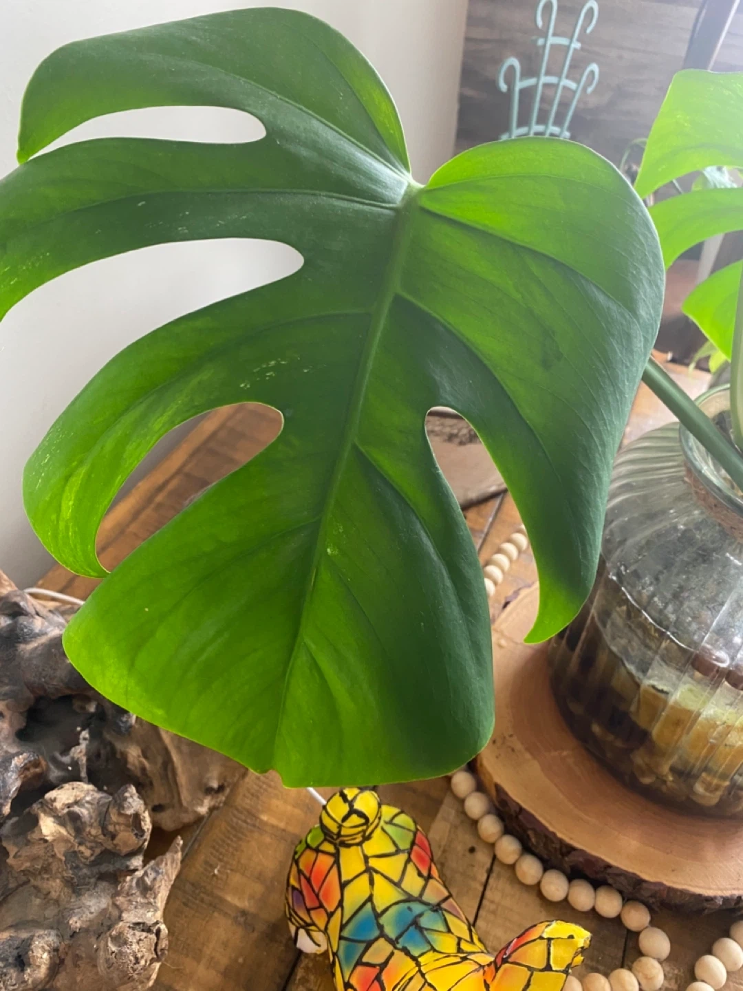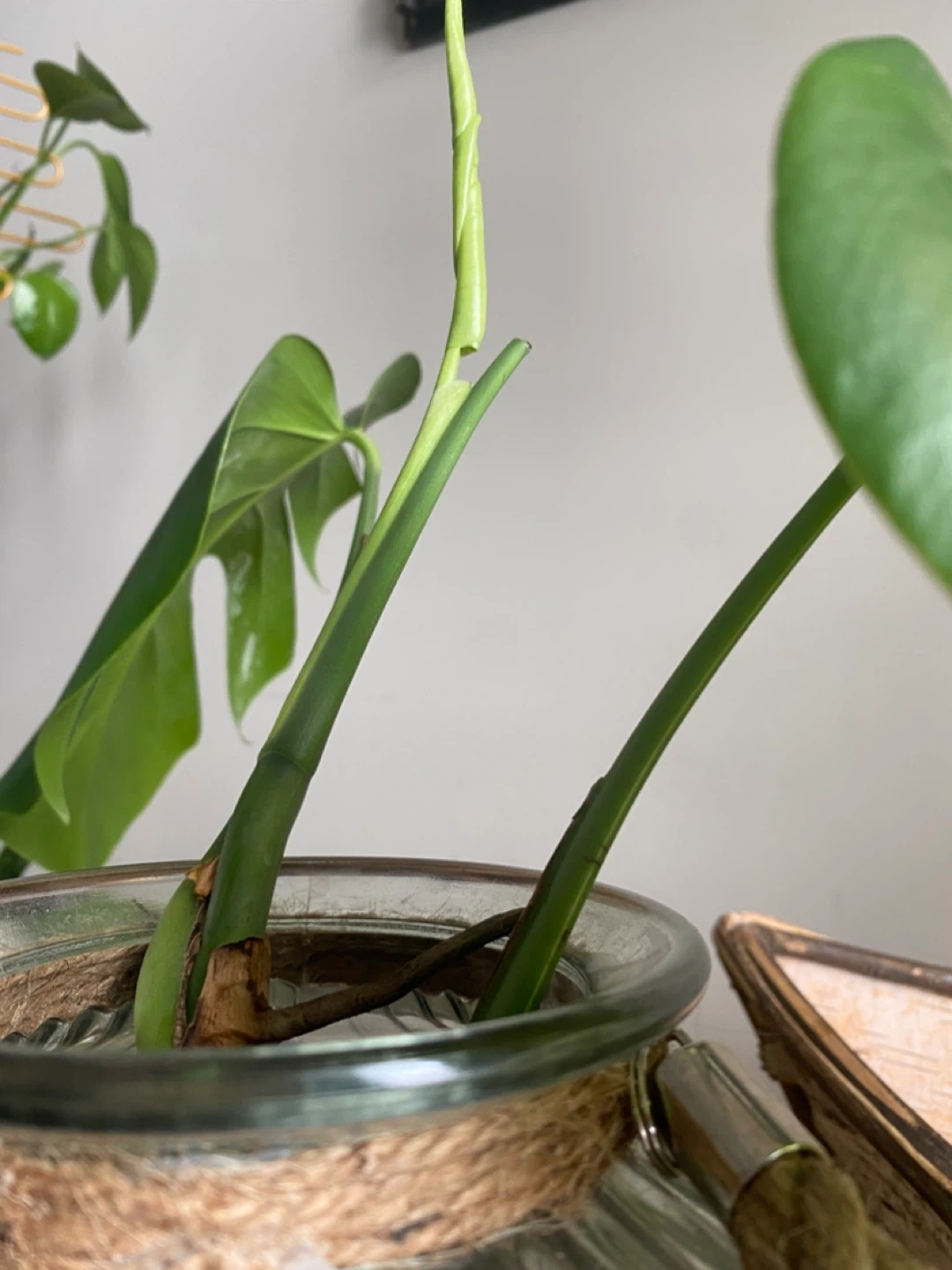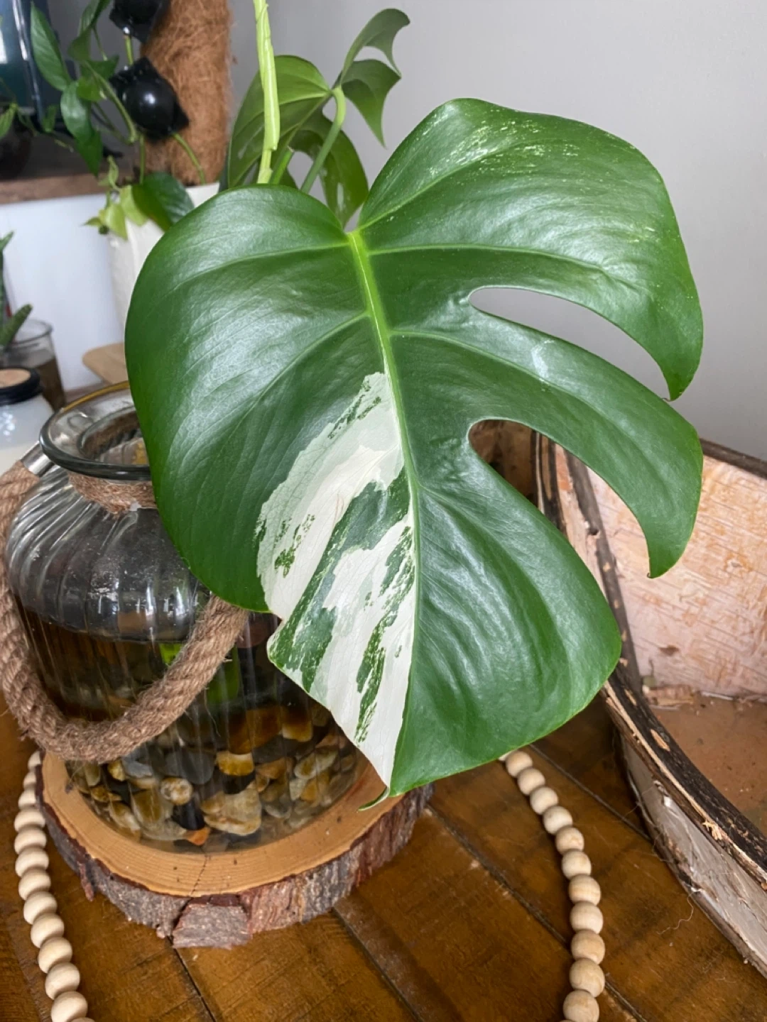 A healthy cutting of a variegated Monstera Deliciosa. It's currently rooted in water and showing new growth! The striking white and green variegation makes this a beautiful addition to any plant collection. This cuttings has numerous amounts of roots growing hydroponically. It was cut off top of the Mom plant 5 months ago and it flourishing with a new leaf unraveling. Thats why these plants are so popular because every leaf has it own unique markings. The two main leafs are adults, so they will push out two more leafs by Spring. Highly variegated with green and white accents….absolutely stunning! It's in a decorative glass vase with stones and a rope accent. Totally up the you, if you want to transplant into soil. No soil, no gnats in the spring!! All you have to do is add fresh water and place this beauty in front of a bright window. There’s nothing more majestic than an albo monstera!!❤️❤️