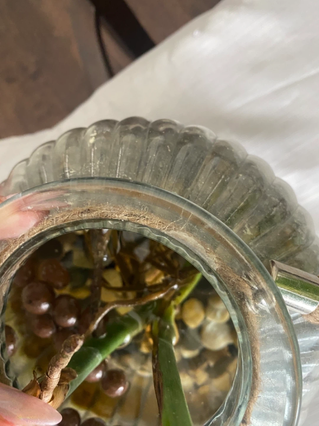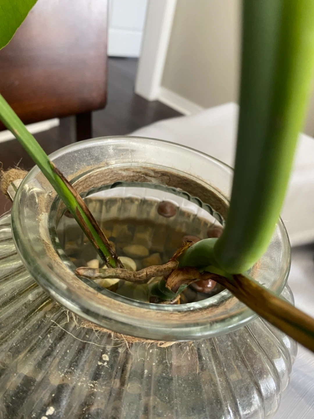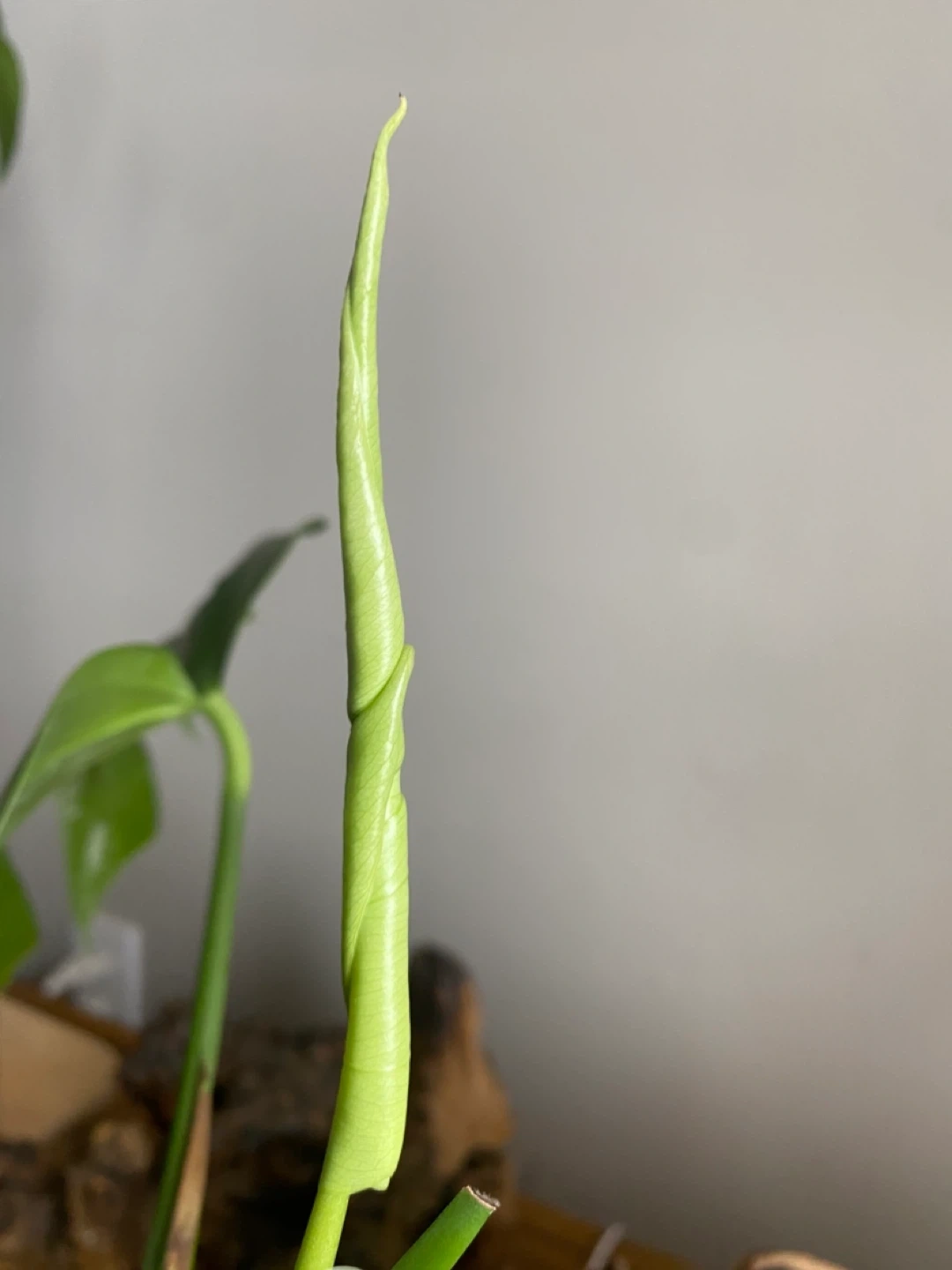 A healthy cutting of a variegated Monstera Deliciosa. It's currently rooted in water and showing new growth! The striking white and green variegation makes this a beautiful addition to any plant collection. This cuttings has numerous amounts of roots growing hydroponically. It was cut off top of the Mom plant 5 months ago and it flourishing with a new leaf unraveling. Thats why these plants are so popular because every leaf has it own unique markings. The two main leafs are adults, so they will push out two more leafs by Spring. Highly variegated with green and white accents….absolutely stunning! It's in a decorative glass vase with stones and a rope accent. Totally up the you, if you want to transplant into soil. No soil, no gnats in the spring!! All you have to do is add fresh water and place this beauty in front of a bright window. There’s nothing more majestic than an albo monstera!!❤️❤️