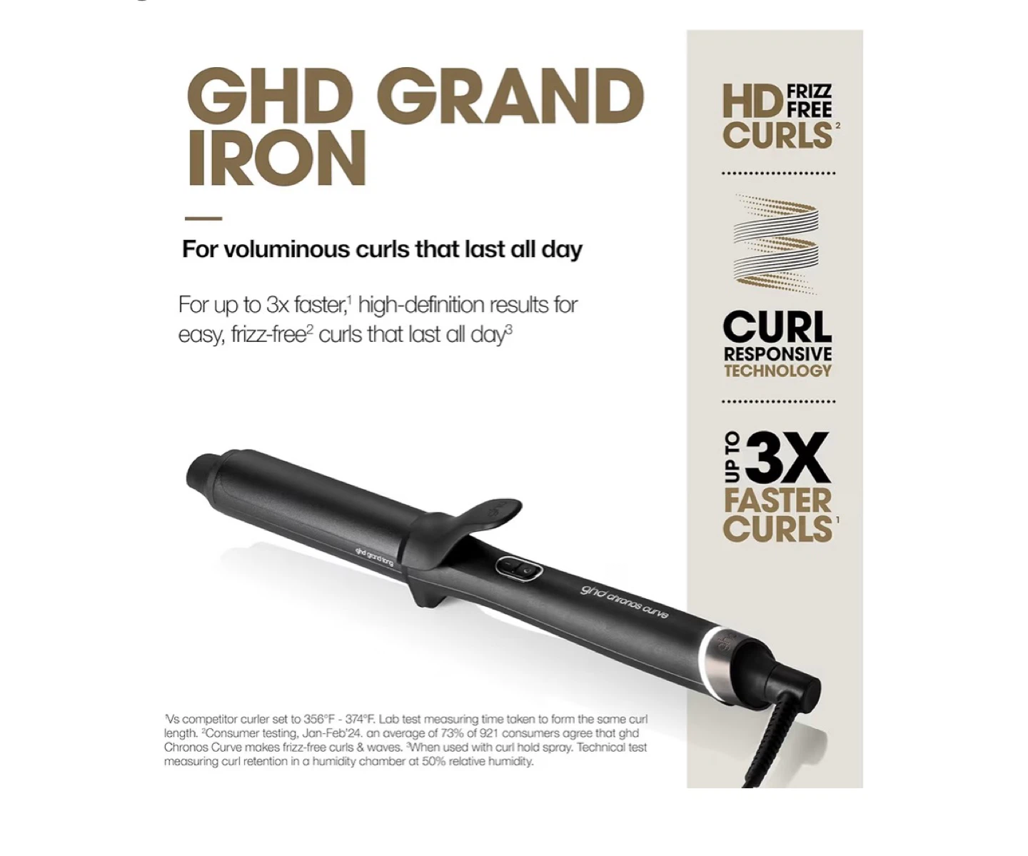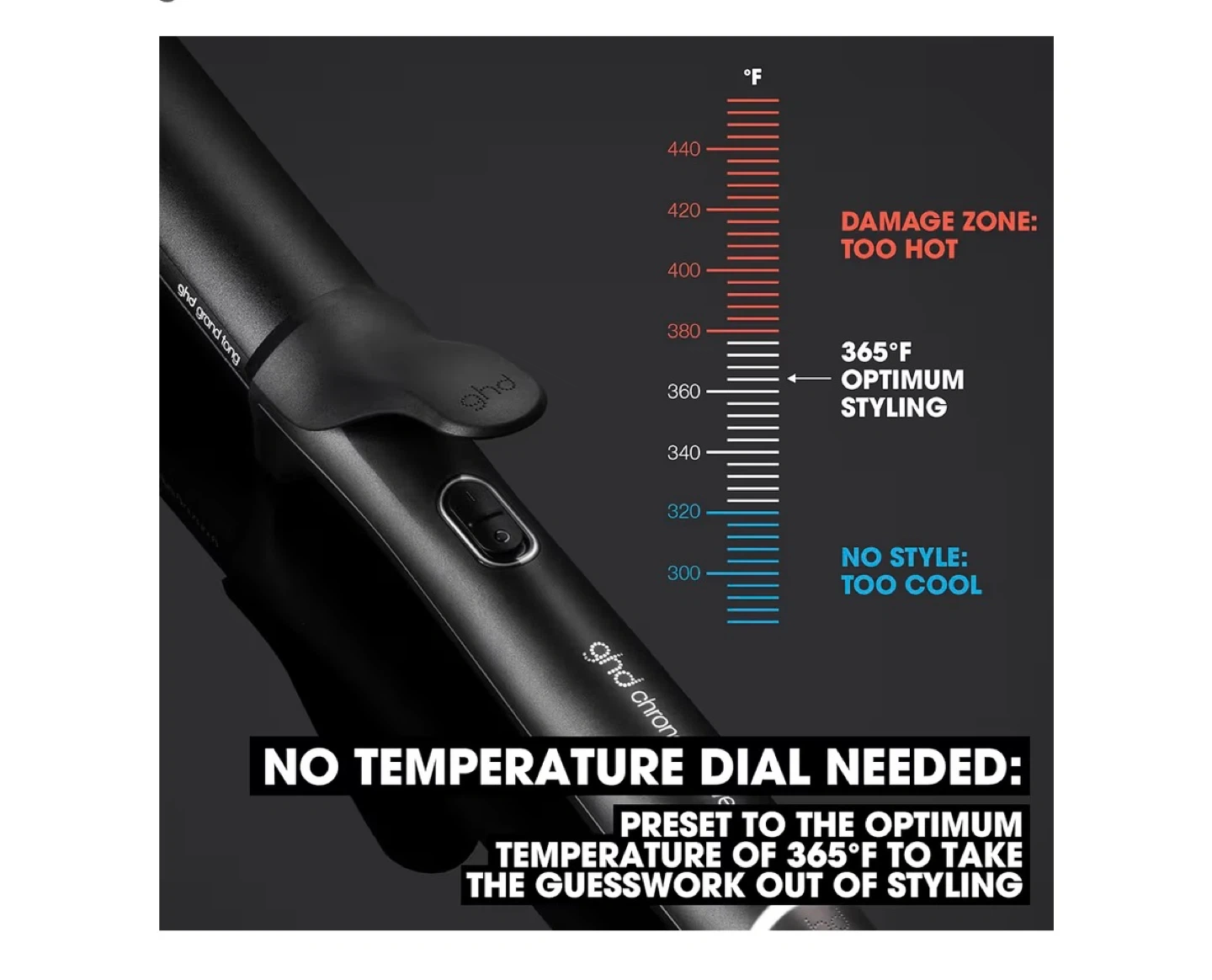 This GHD curling iron is designed for voluminous curls that last all day. It features Curl Responsive Technology and heats up to 3x faster for high-definition results. The wand is preset to an optimum styling temperature of 365°F to take the guesswork out of styling.