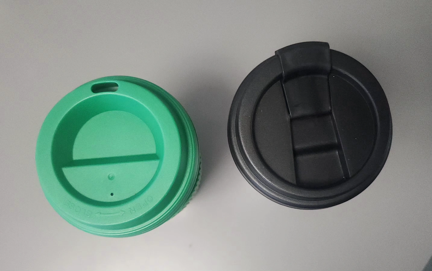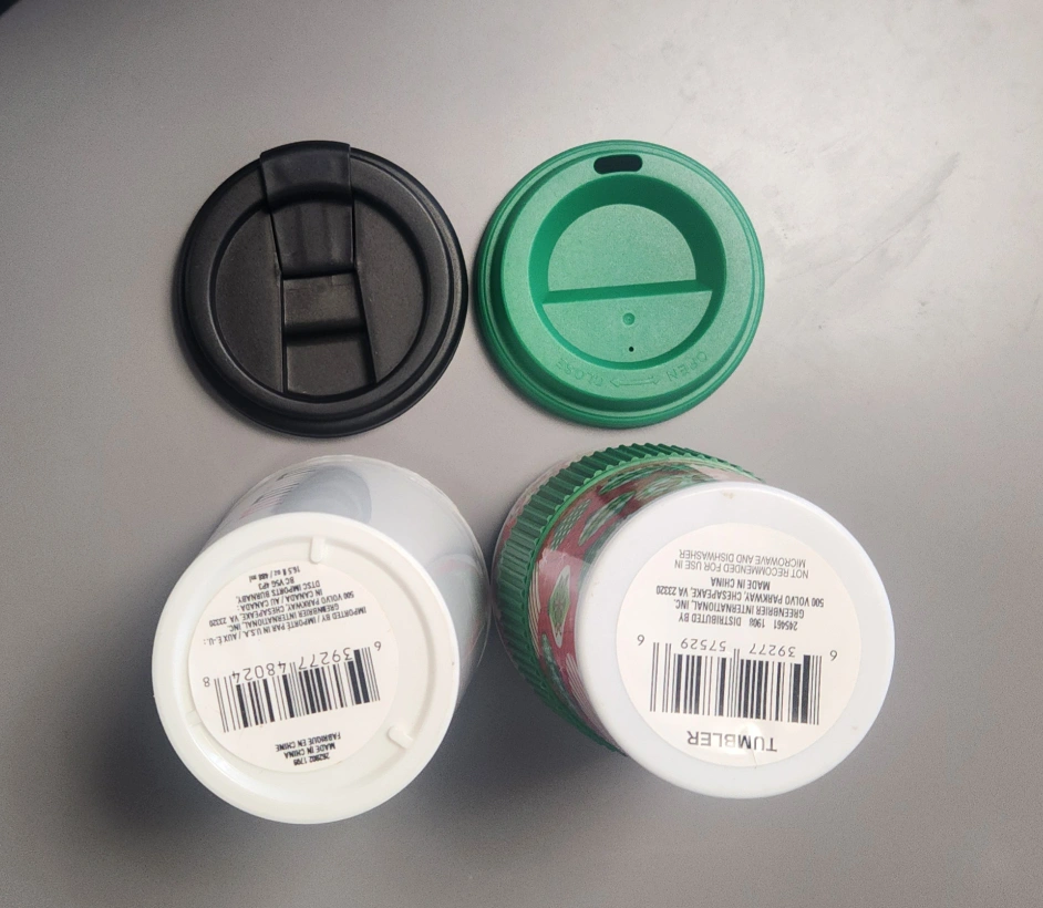Holiday themed reusable plastic coffee cups. Christmas design with a green lid. Cups are in excellent condition as they've never been used. $5 each.