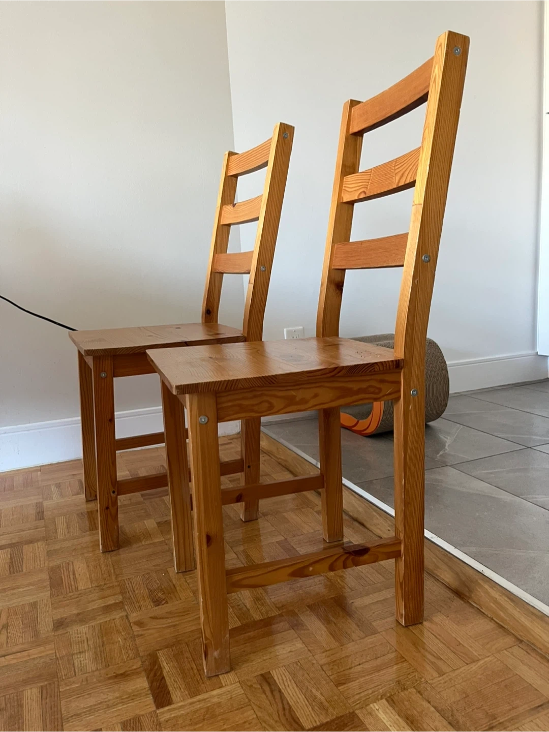 Selling a set of two used wooden chairs. They show visible signs of wear from regular use and have been reinforced with extra screws for added stability. The chairs have a natural wood finish.