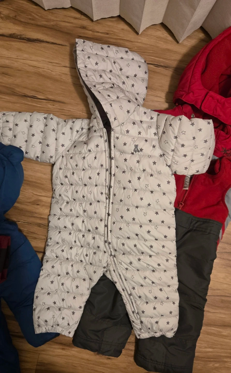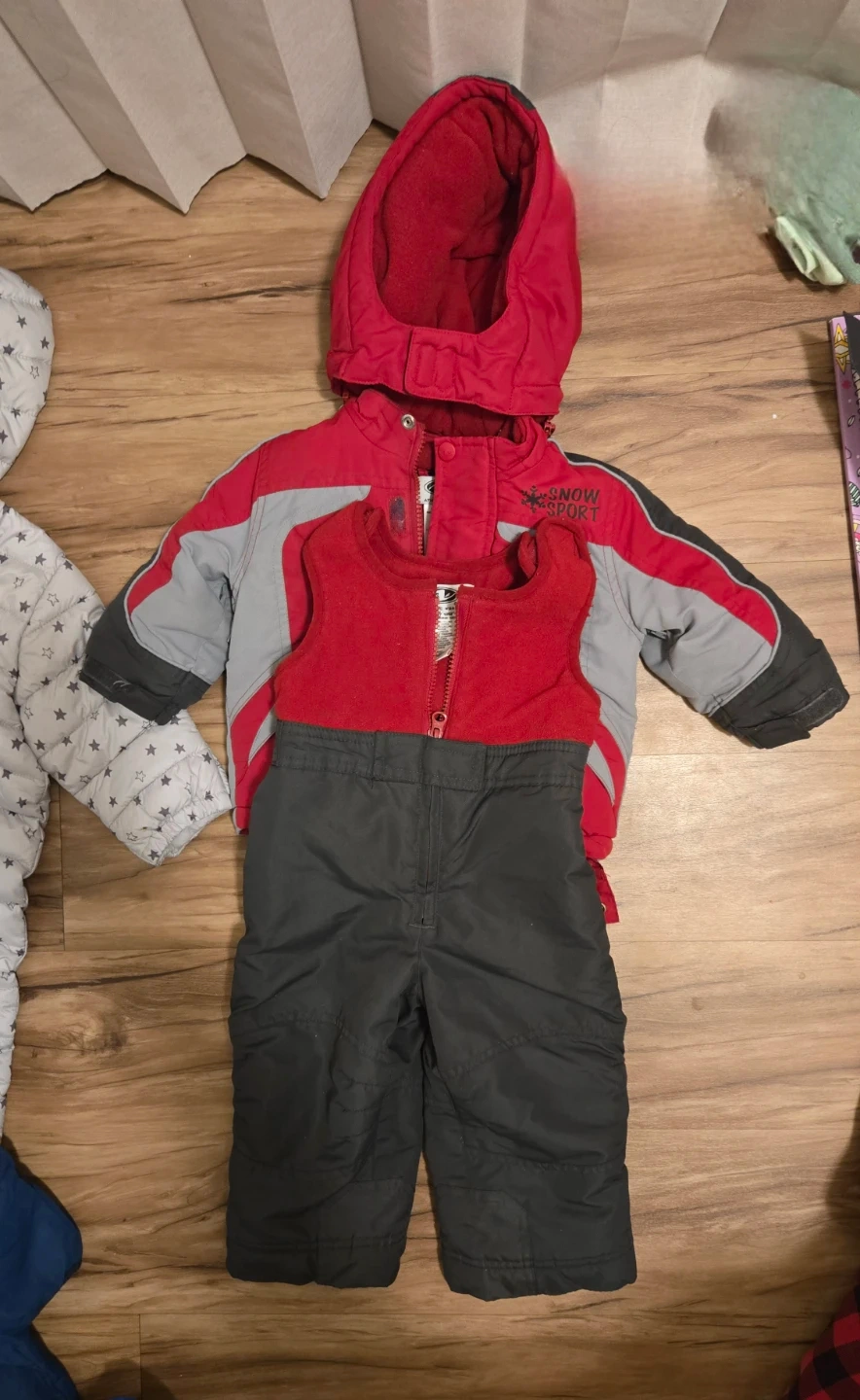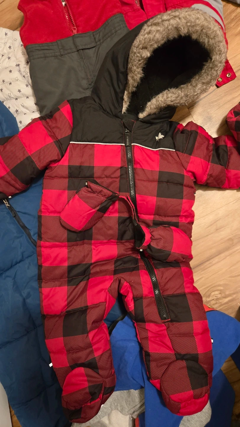 Includes a grey star print snowsuit, a red buffalo plaid snowsuit with fur-lined hood, a blue puffer jacket, a red and grey snow pant set with a zip-up vest, a blue Superman onesie with cape, and a grey Superman zipper sleeper. Great for keeping little ones warm and cozy!