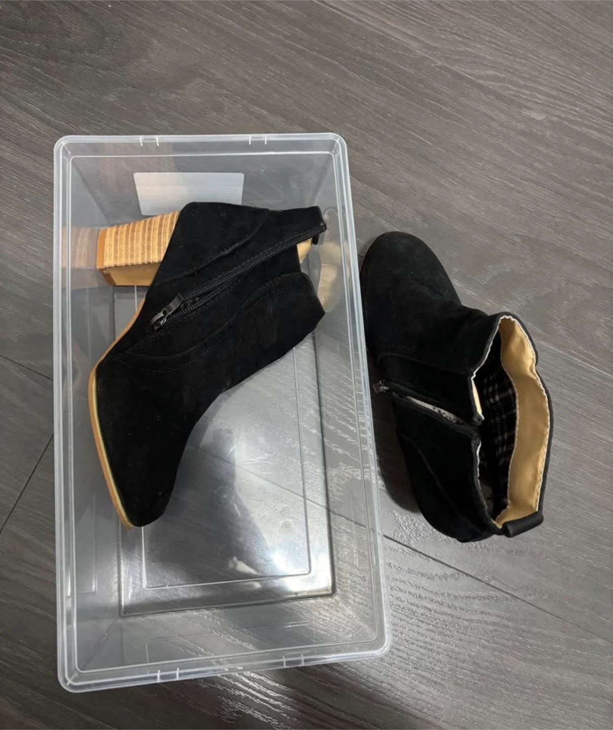 Black suede ankle boots with a wooden block heel. Features a side zipper closure and a plaid lining. These boots have a stylish look for fall or winter wear. Size fits 7 to 8. Used only once so it’s kind of NEW.