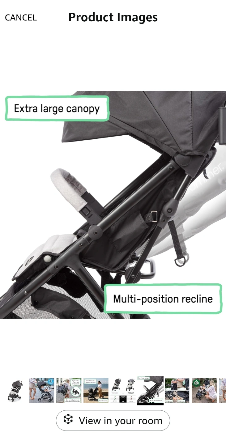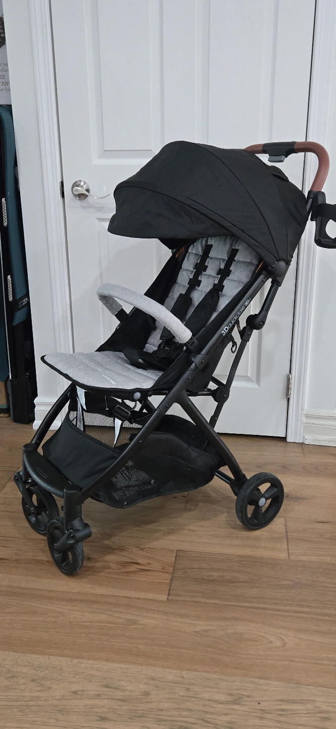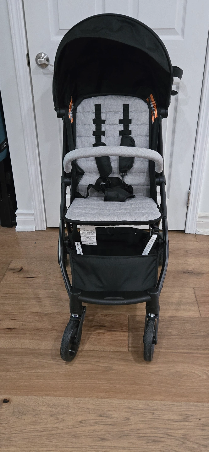 Lightweight stroller, folds easily. Grey fabric with black frame. Features three-panel canopy and removable arm bar.