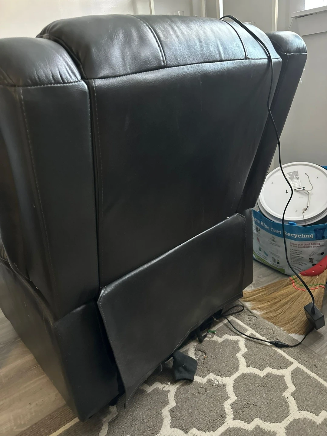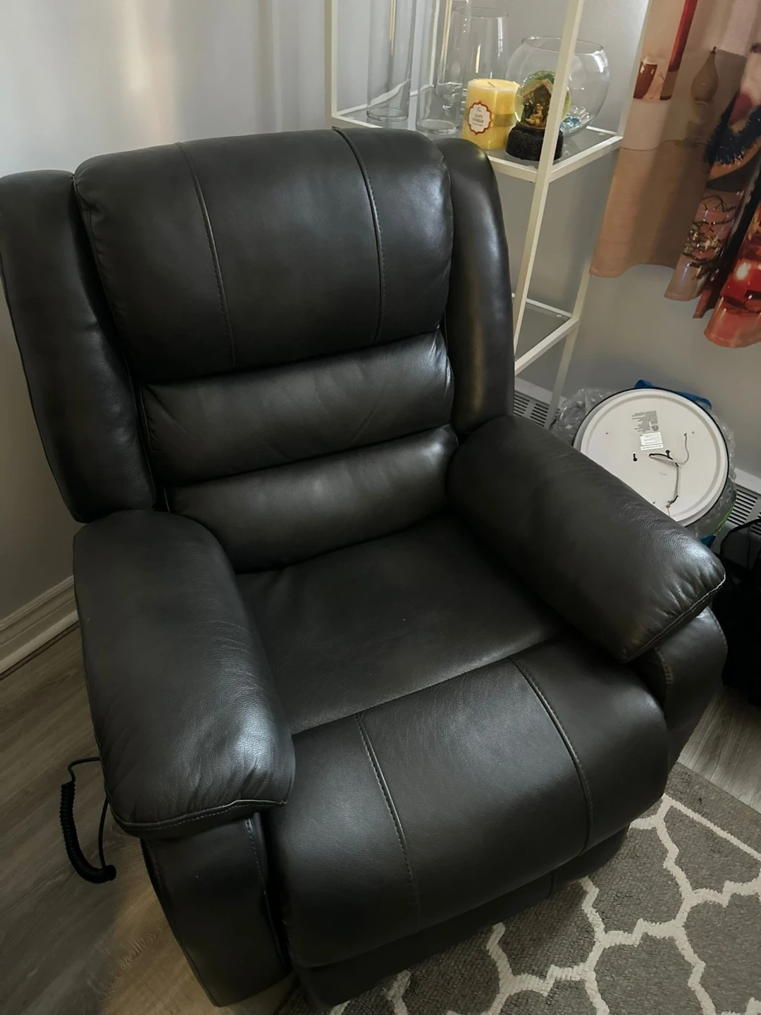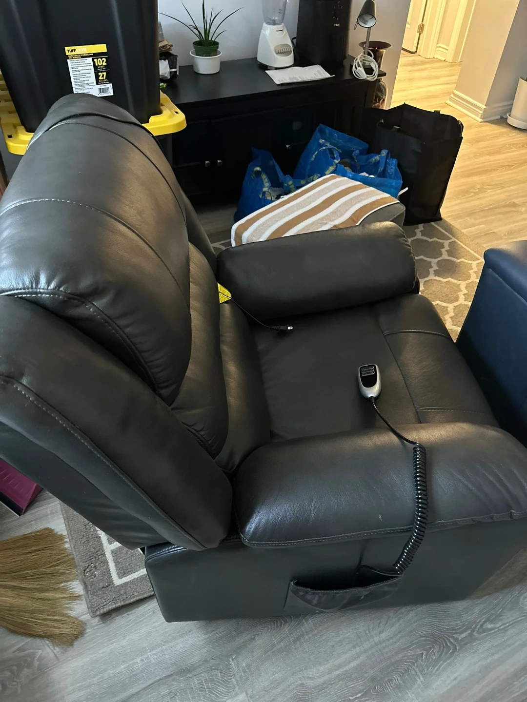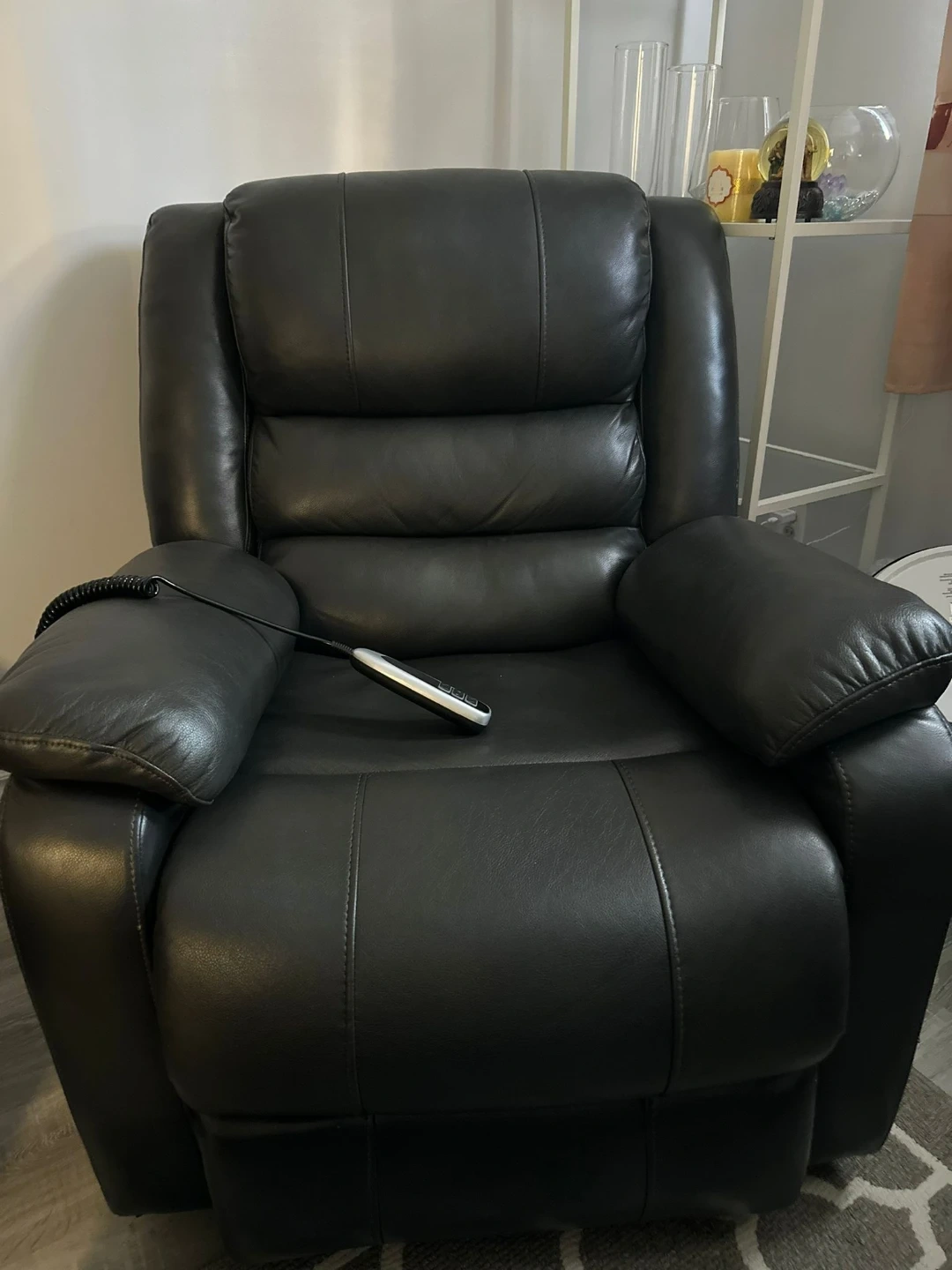 This is a black leather power recliner chair, perfect for relaxing. It comes with a remote for easy adjustment of the reclining position. The chair is made of durable faux leather and has a comfortable padded design.Pick up @ Long branch, Etobicoke. Call this number 647 949 2962 now