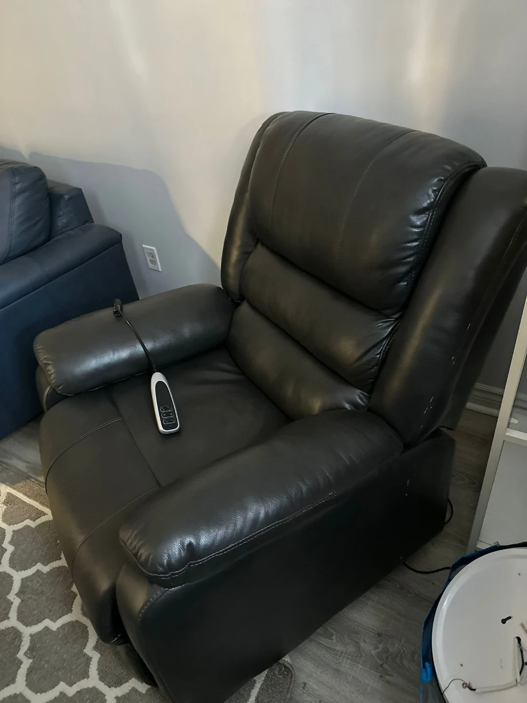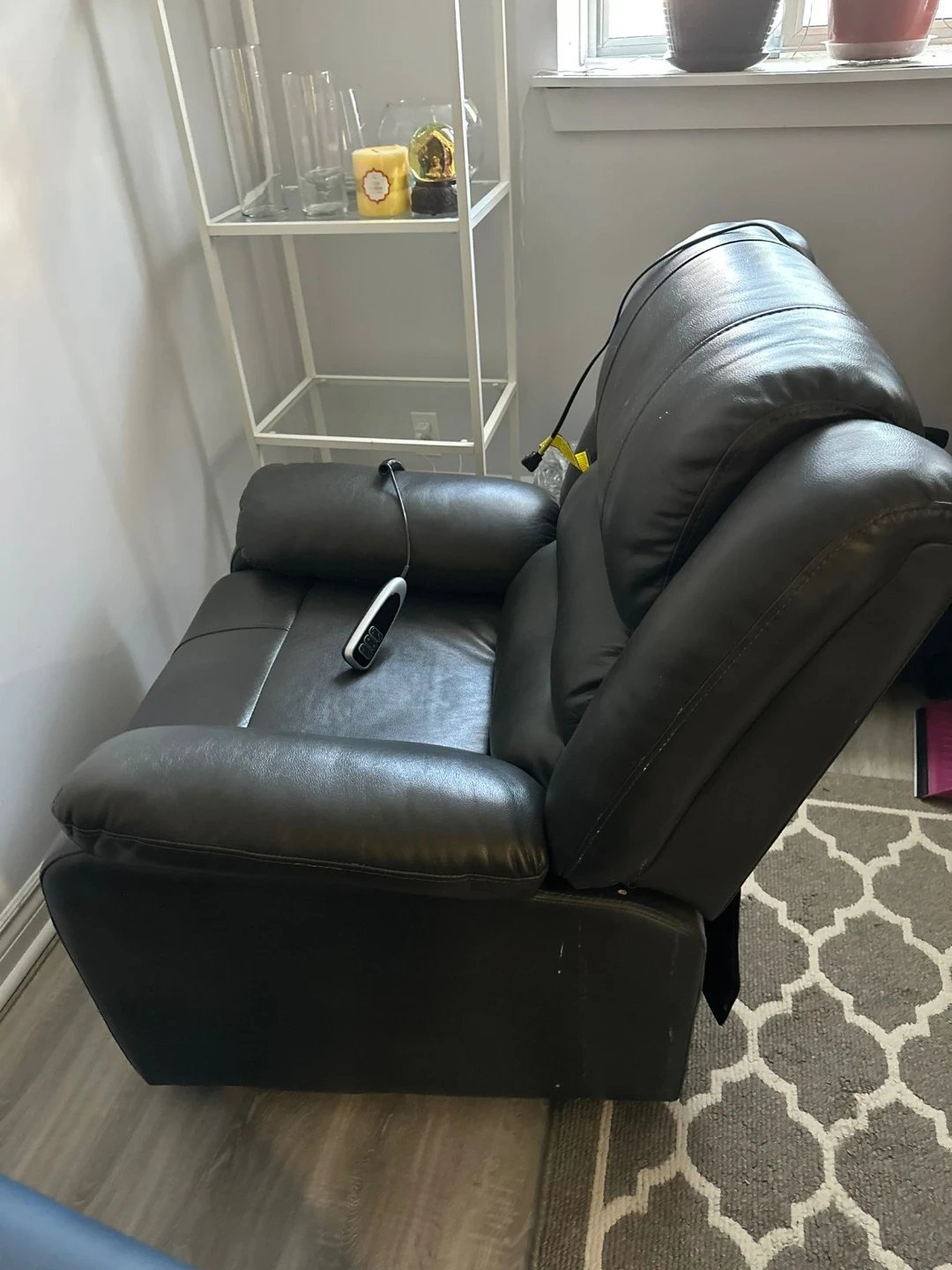 This is a black leather power recliner chair, perfect for relaxing. It comes with a remote for easy adjustment of the reclining position. The chair is made of durable faux leather and has a comfortable padded design.Pick up @ Long branch, Etobicoke. Call this number 647 949 2962 now