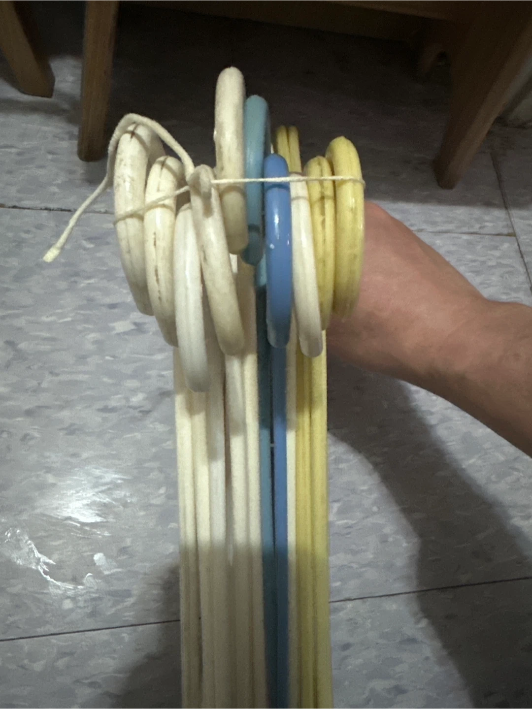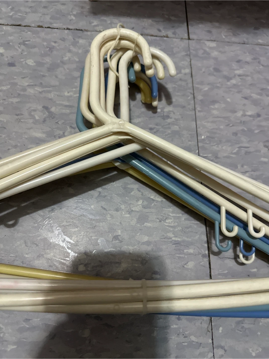Set of 10 plastic hangers in white, yellow, and blue. These hangers are great for organizing closets. They're durable and suitable for most clothing types.