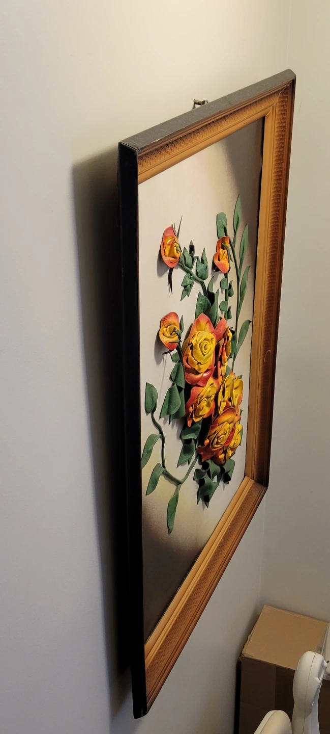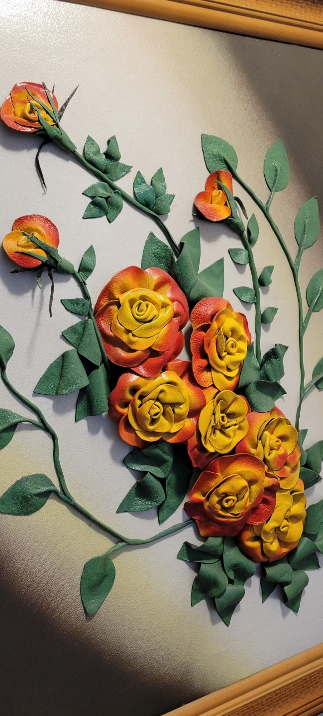 This is a framed wall art piece featuring a floral design with sculpted roses and leaves. It's finished with a classic wooden frame. Made with real leather materials beautifully designed picture.