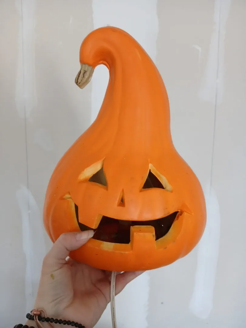 This ceramic jack-o'-lantern lamp is perfect for Halloween decor. It features a classic carved face design. Its bright orange colour adds a festive touch. A great piece to light up your seasonal festivities!
