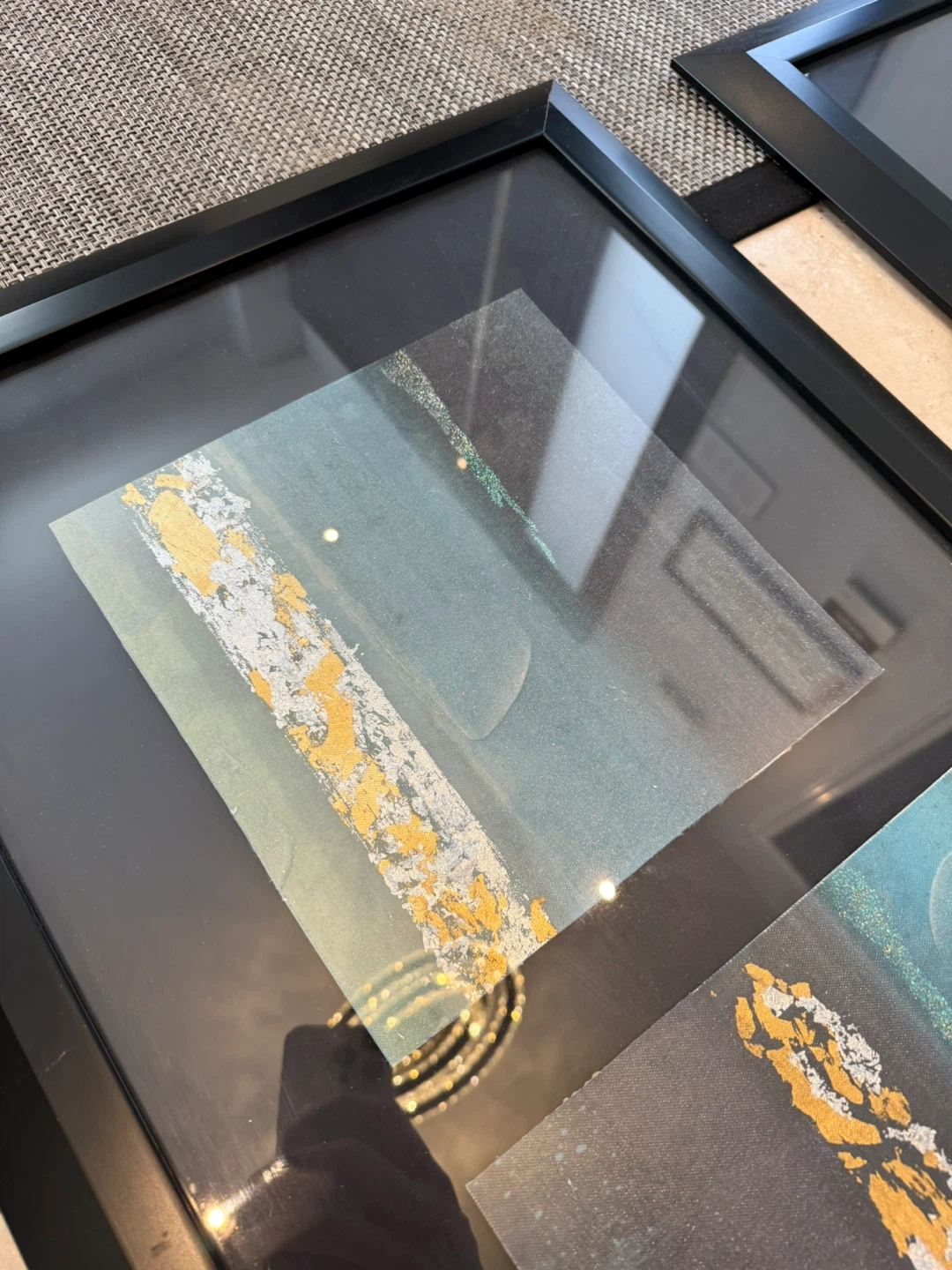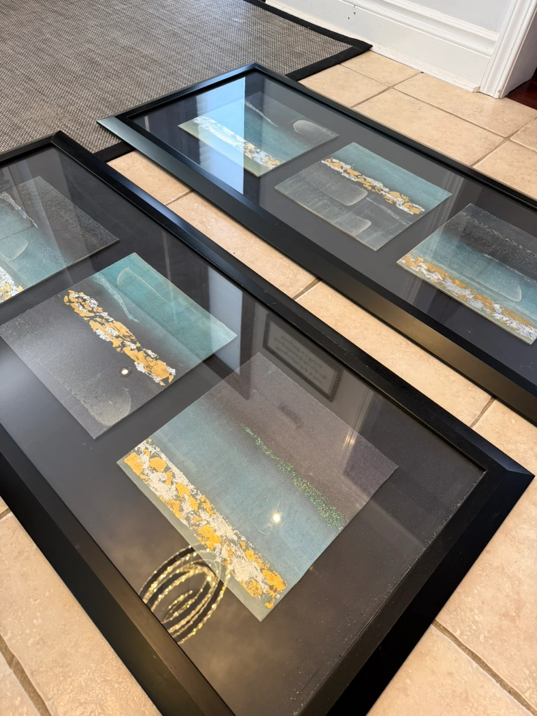 Two custom made framed art pieces featuring abstract designs with teal, grey, and gold accents. Each frame is black and contains three smaller panels with a textured effect.