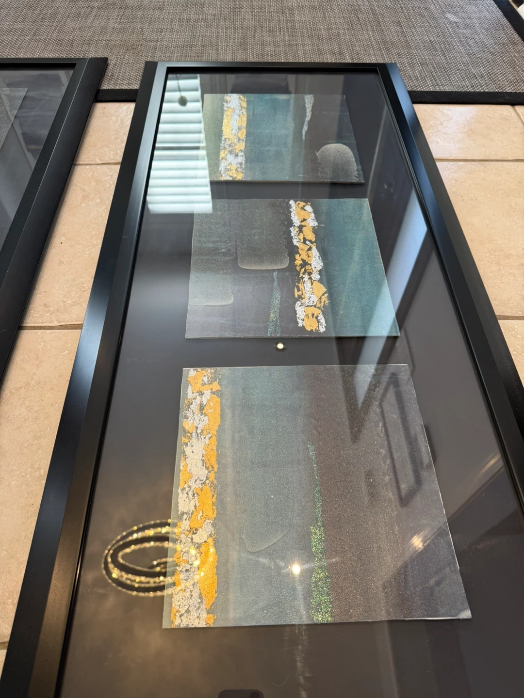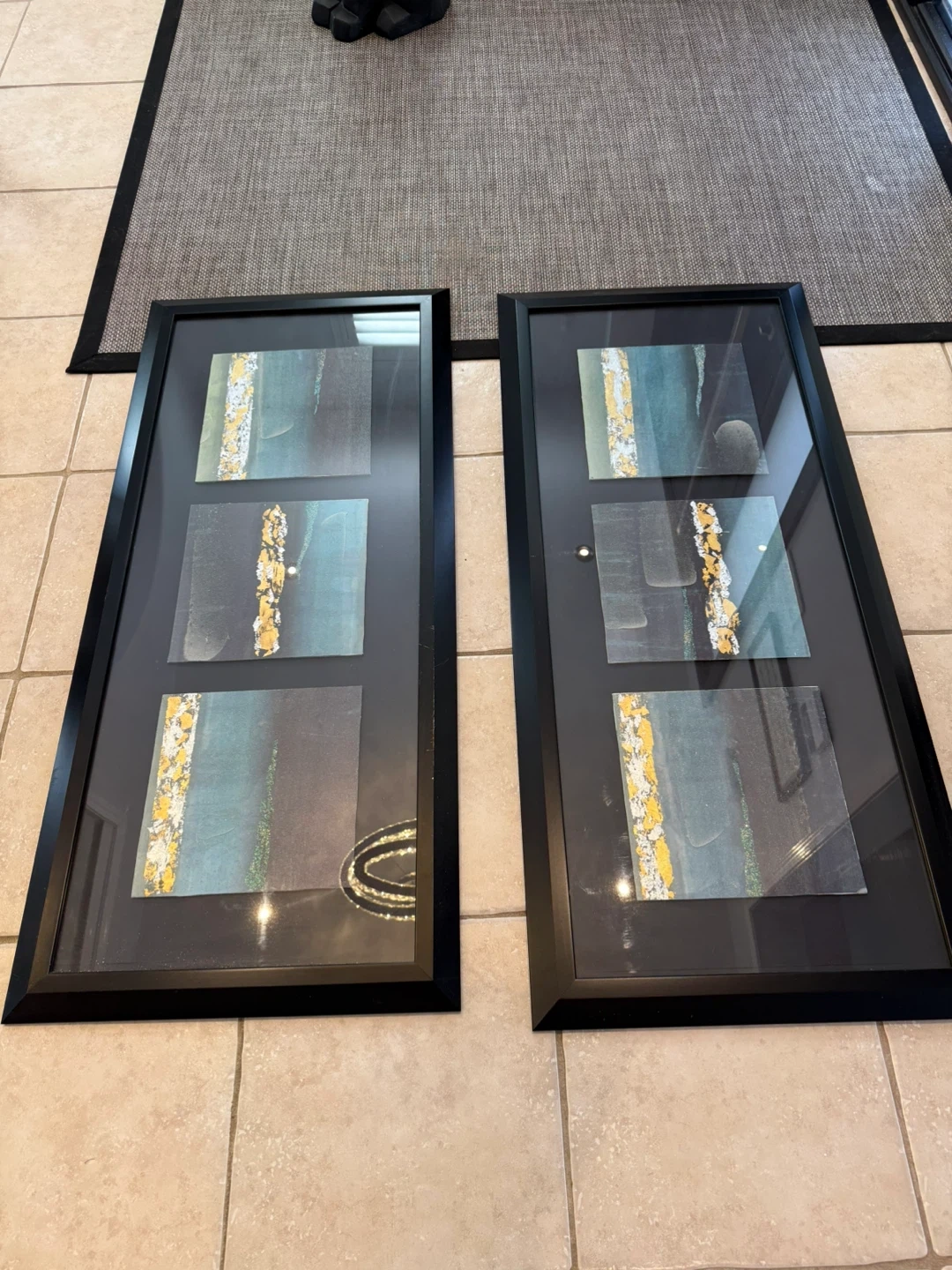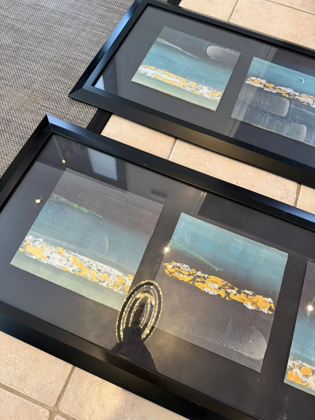 Two custom made framed art pieces featuring abstract designs with teal, grey, and gold accents. Each frame is black and contains three smaller panels with a textured effect.