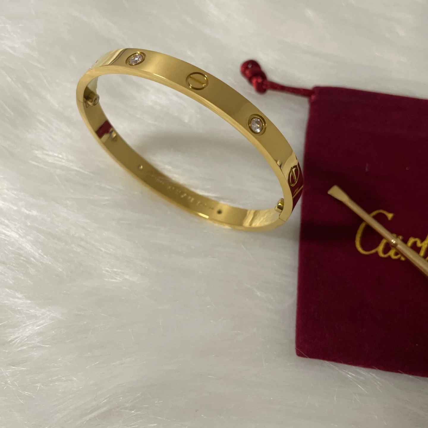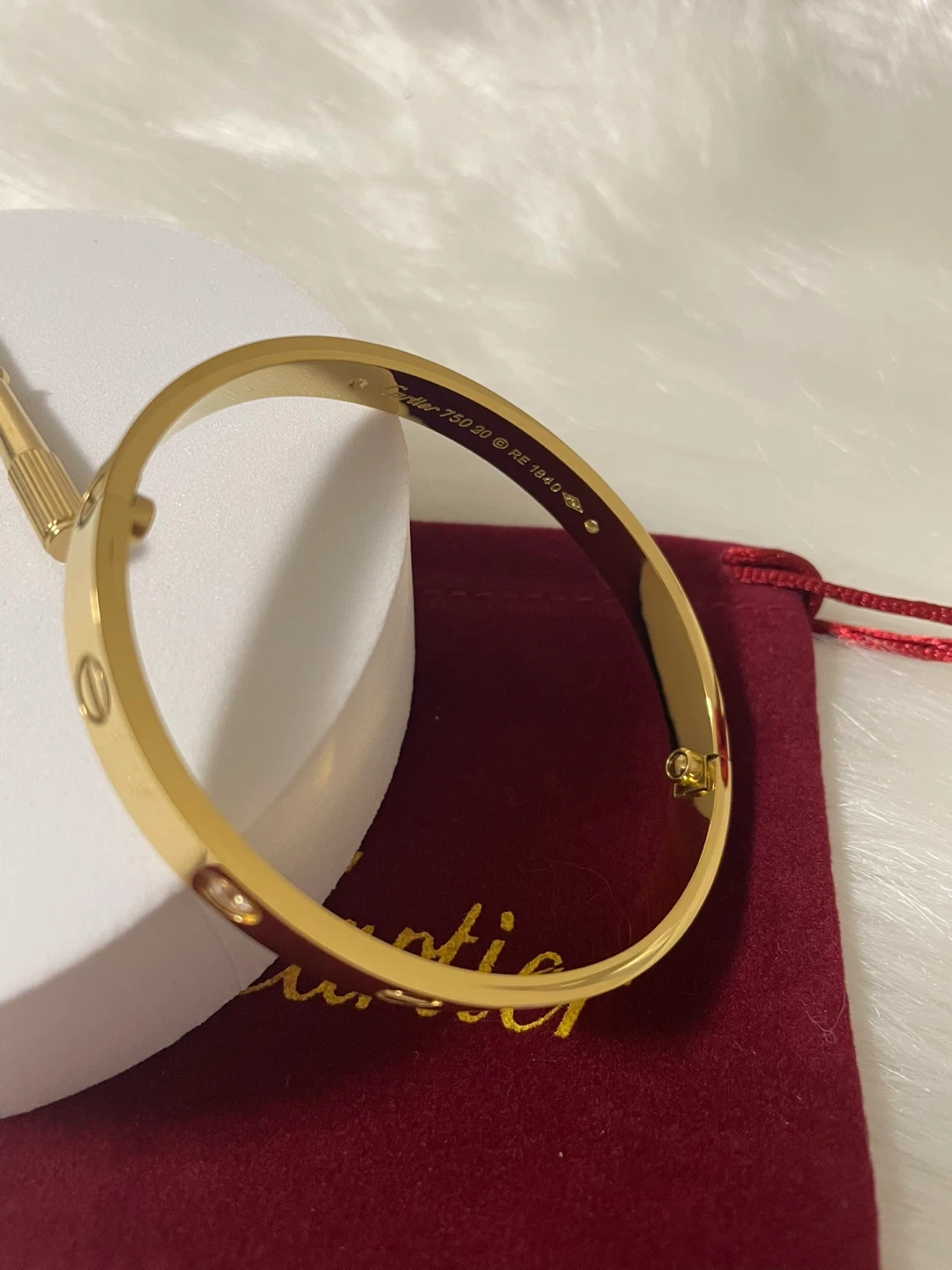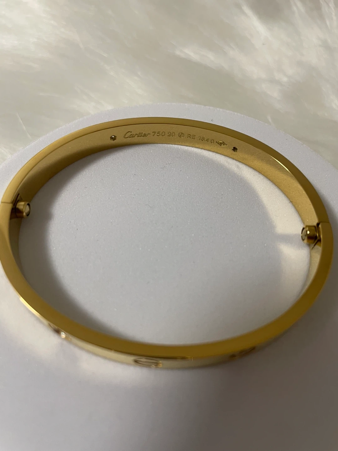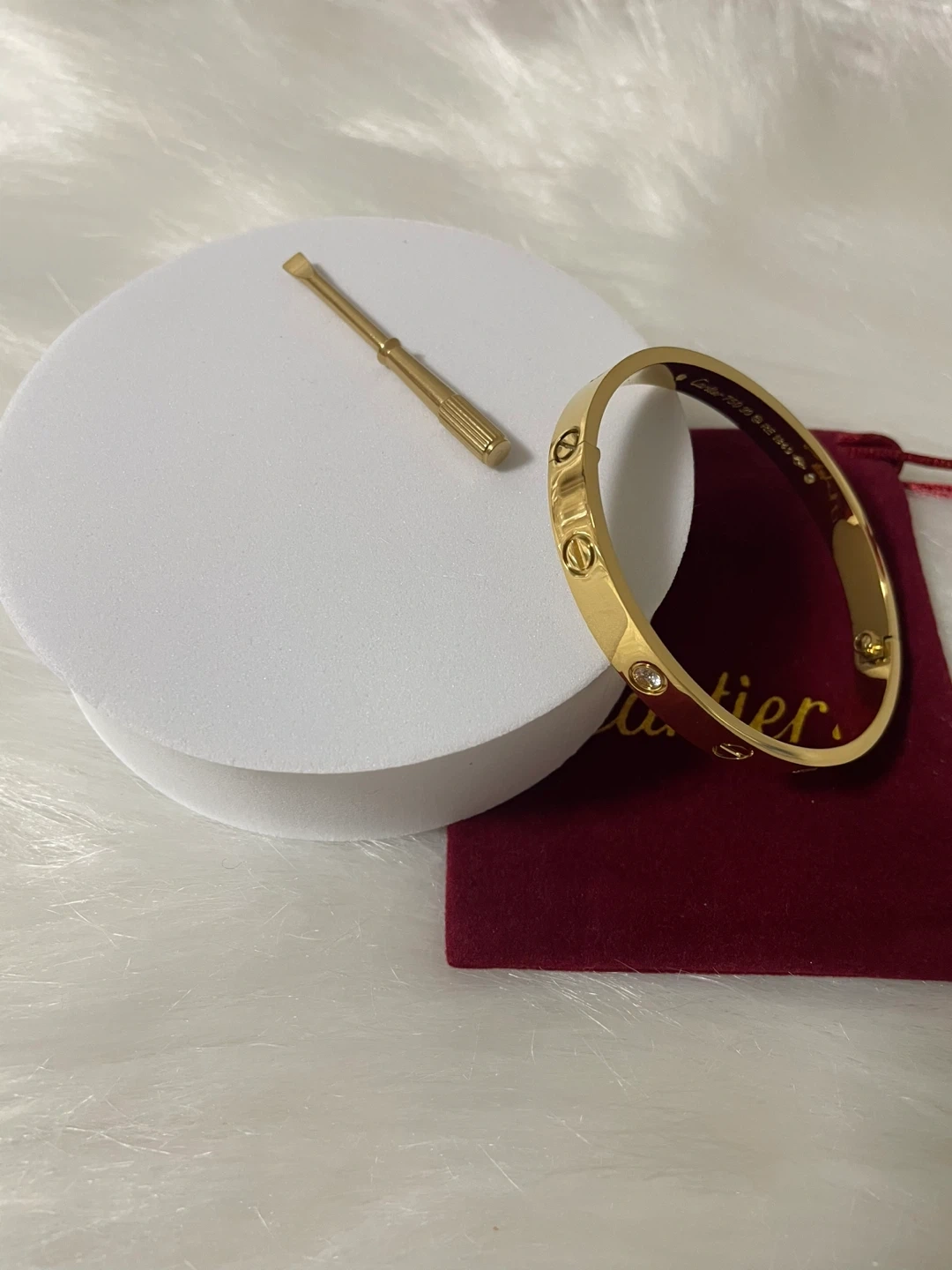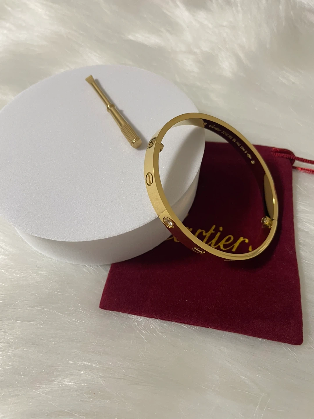 This is a Cartier Love bracelet in yellow gold with diamonds. It's a classic piece, perfect for everyday wear or special occasions. Includes the original tool and a velvet pouch.