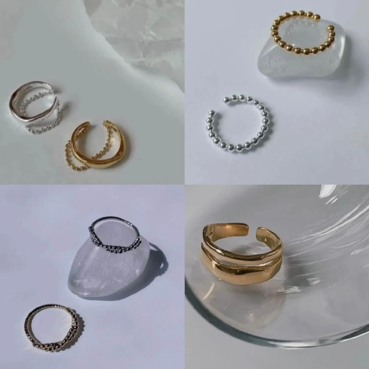 This set includes four fashionable rings, two in a shiny gold tone and two in a sleek silver tone. Designs vary, with some featuring beaded details and others a minimalist, open-band style.