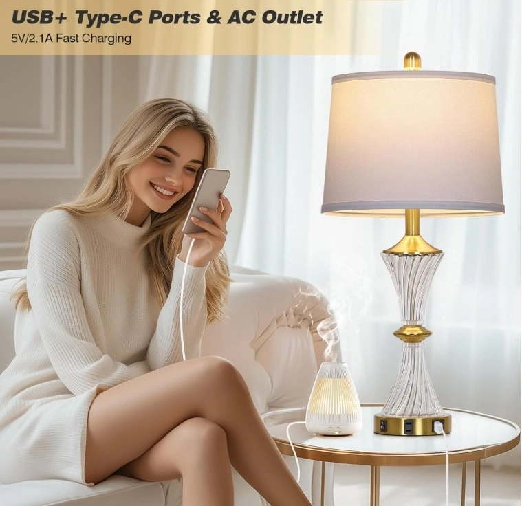 Elegant design with a stylish gold base and crystal clear crystals, perfect for creating a cozy ambiance. These 28" tall white glass table lamps with white drum shades will easily match modern minimalist or traditional luxury decor. Each lamp comes with an E26 LED bulb (800 lumens, 2700K, 25,000 hours lifespan) that saves energy. The lampshade softens the light for comfortable reading without flickering or glare. The built-in 5V/2.1A dual USB charging ports (Type-C and standard USB) and 120V AC power outlet allow you to conveniently charge up to 3 devices simultaneously, even when the lamp is off. Ideal for bedside, end tables, or office use.
