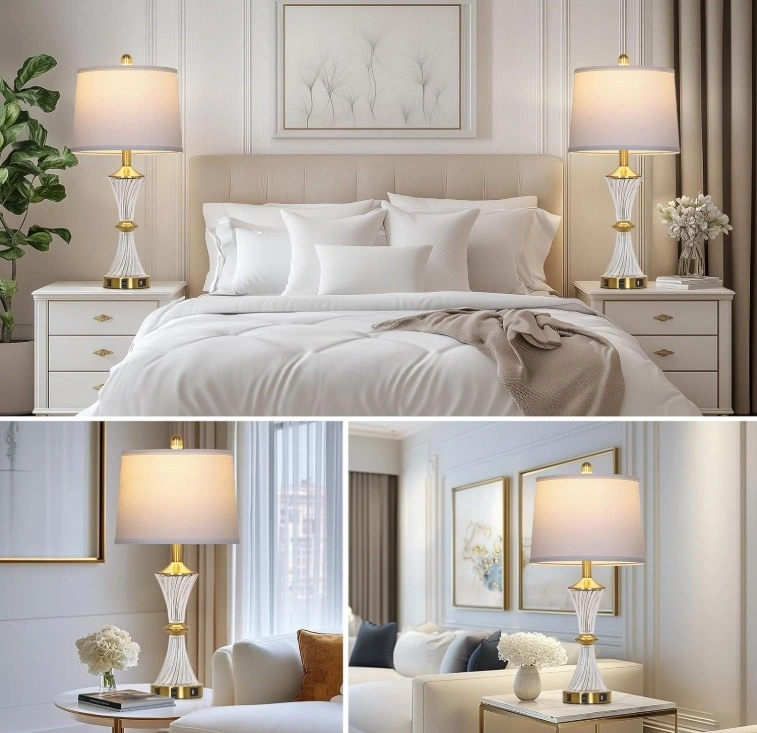 Elegant design with a stylish gold base and crystal clear crystals, perfect for creating a cozy ambiance. These 28" tall white glass table lamps with white drum shades will easily match modern minimalist or traditional luxury decor. Each lamp comes with an E26 LED bulb (800 lumens, 2700K, 25,000 hours lifespan) that saves energy. The lampshade softens the light for comfortable reading without flickering or glare. The built-in 5V/2.1A dual USB charging ports (Type-C and standard USB) and 120V AC power outlet allow you to conveniently charge up to 3 devices simultaneously, even when the lamp is off. Ideal for bedside, end tables, or office use.