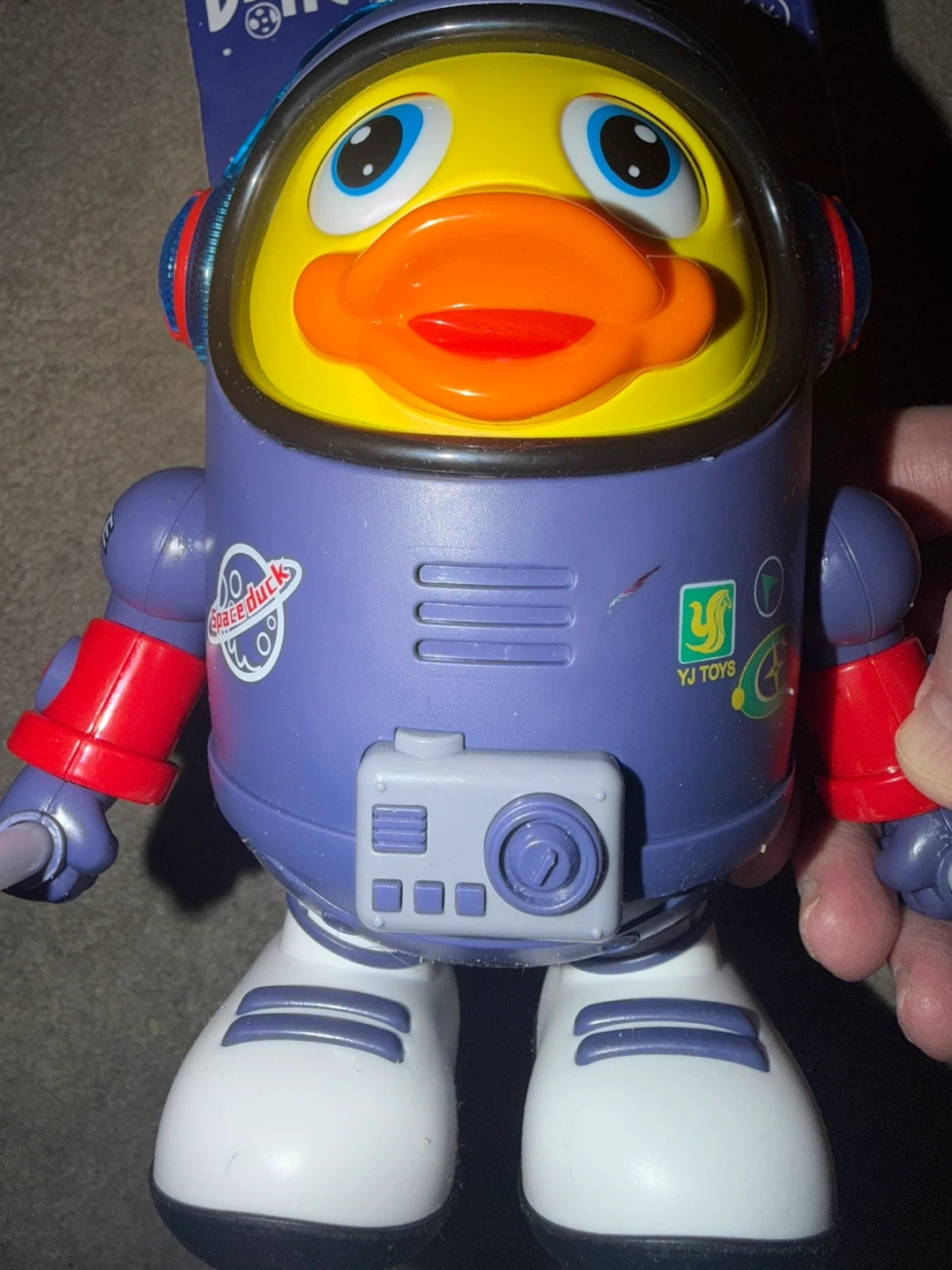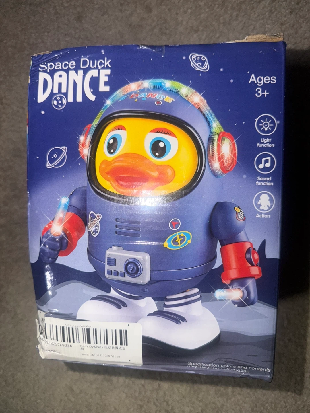 It's a fun dancing duck toy in an astronaut suit! Ages 3+. It has light and sound functions. Watch it do its beautiful dancing!