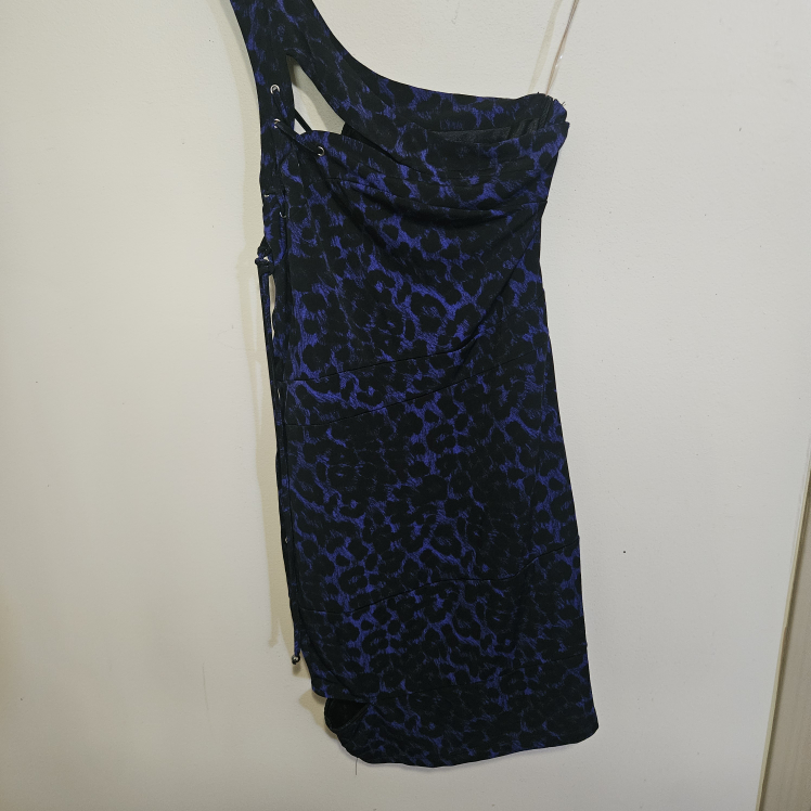 Sexy one shoulder dress with a leopard print blue and black pattern! has a zipper one side of dress and suits on bottom of dress on both sides. It's in great condition.