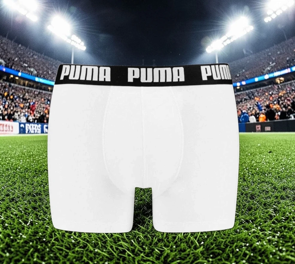 Puma men's boxer briefs in white. They're made with cotton comfort and moisture-wicking fabric. The waistband is durable and soft, and they're tag-free for extra comfort. Stay put construction.