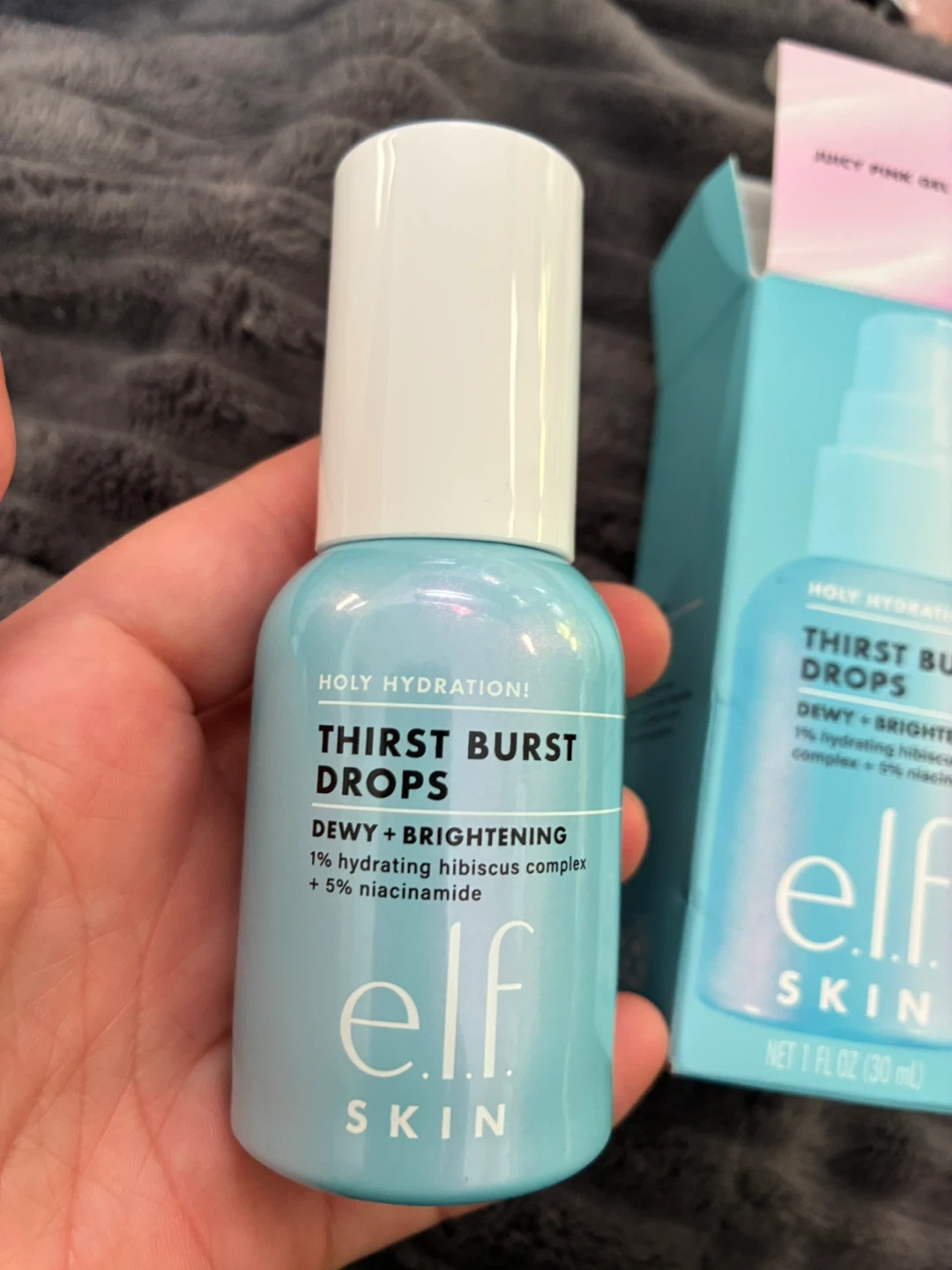 e.l.f. Thirst Burst Drops gel serum for dewy and brightening skin. It's formulated with 1% hydrating hibiscus complex and 5% niacinamide. Skin types are dry, oily, and combination. Net 1 fl oz (30 mL).