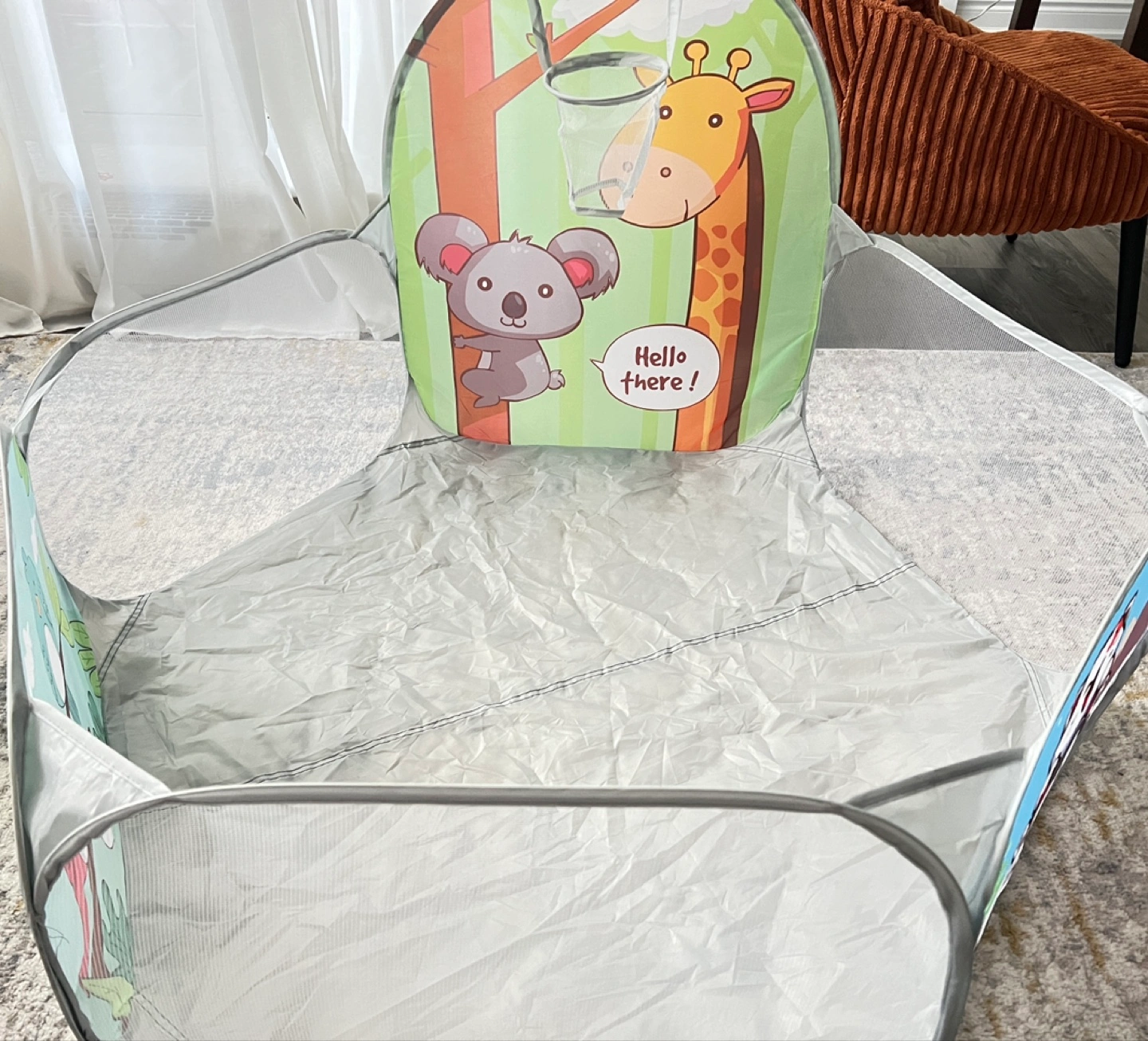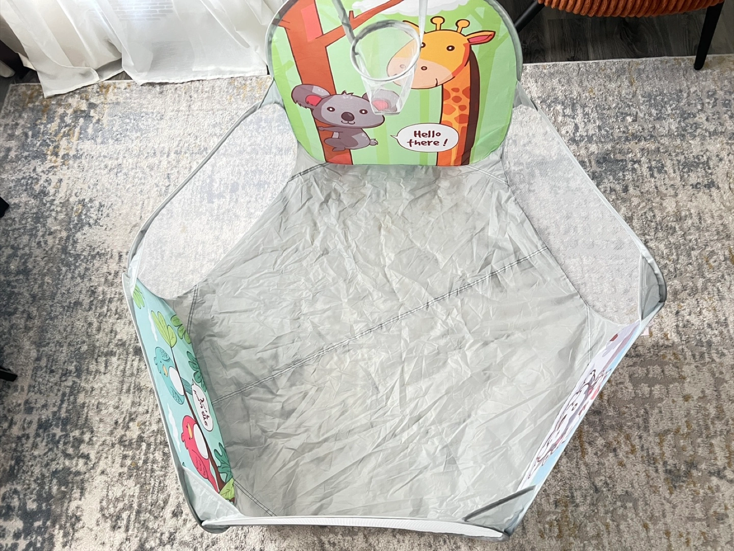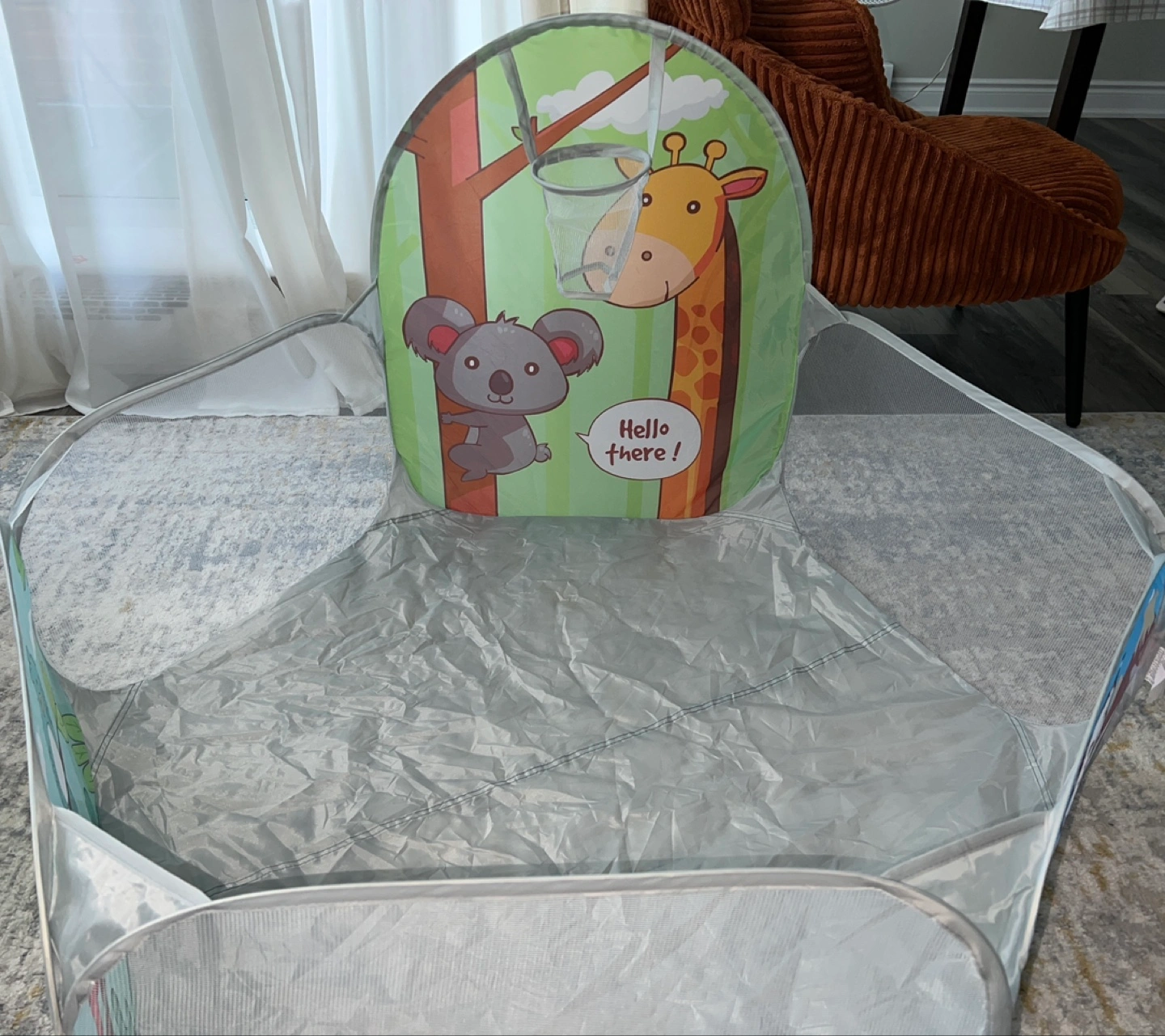 Here's a cute playpen for the little ones! It features a basketball hoop and fun animal designs. Perfect for keeping your kids entertained and safe while they play.(balls are not included)