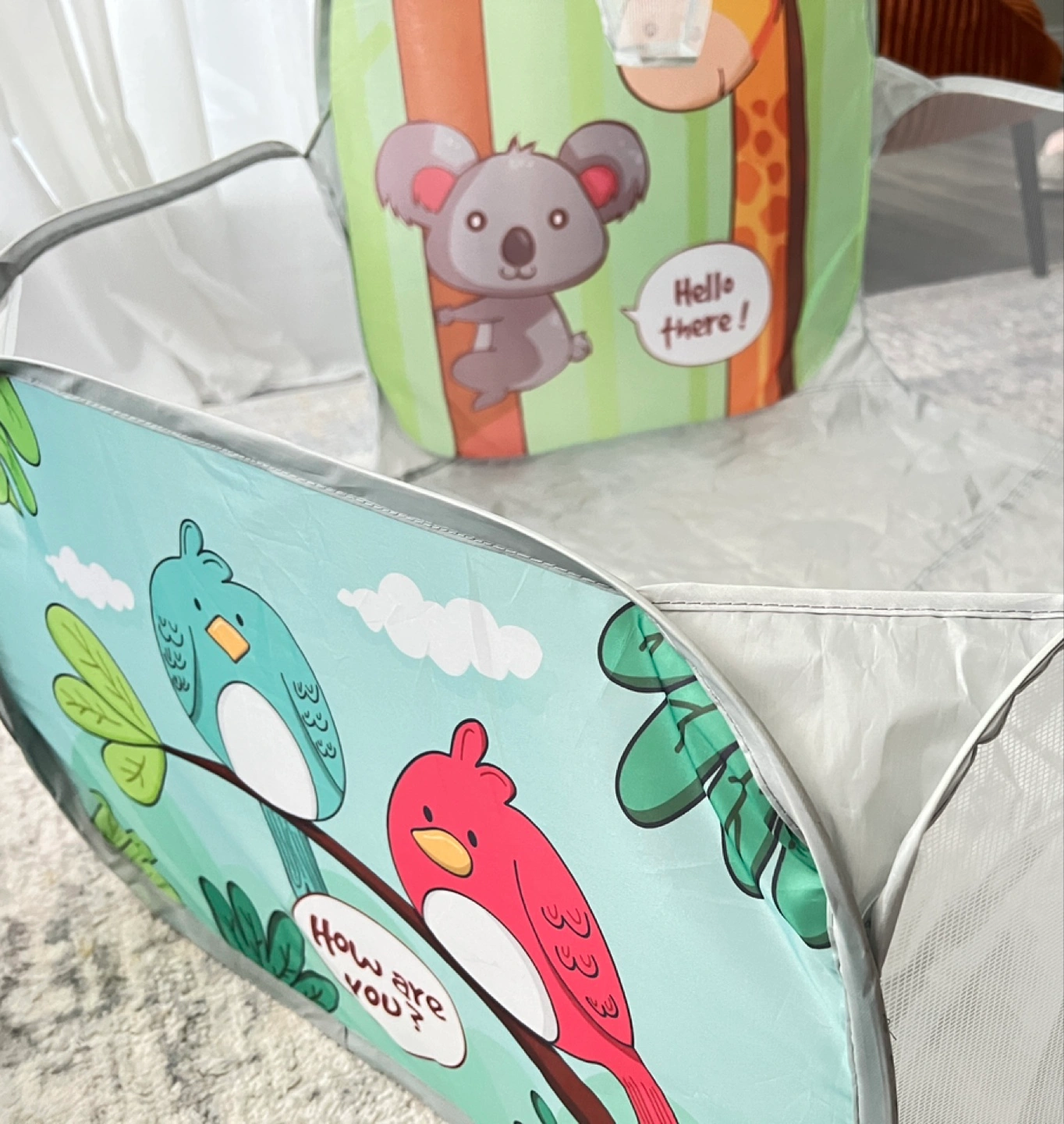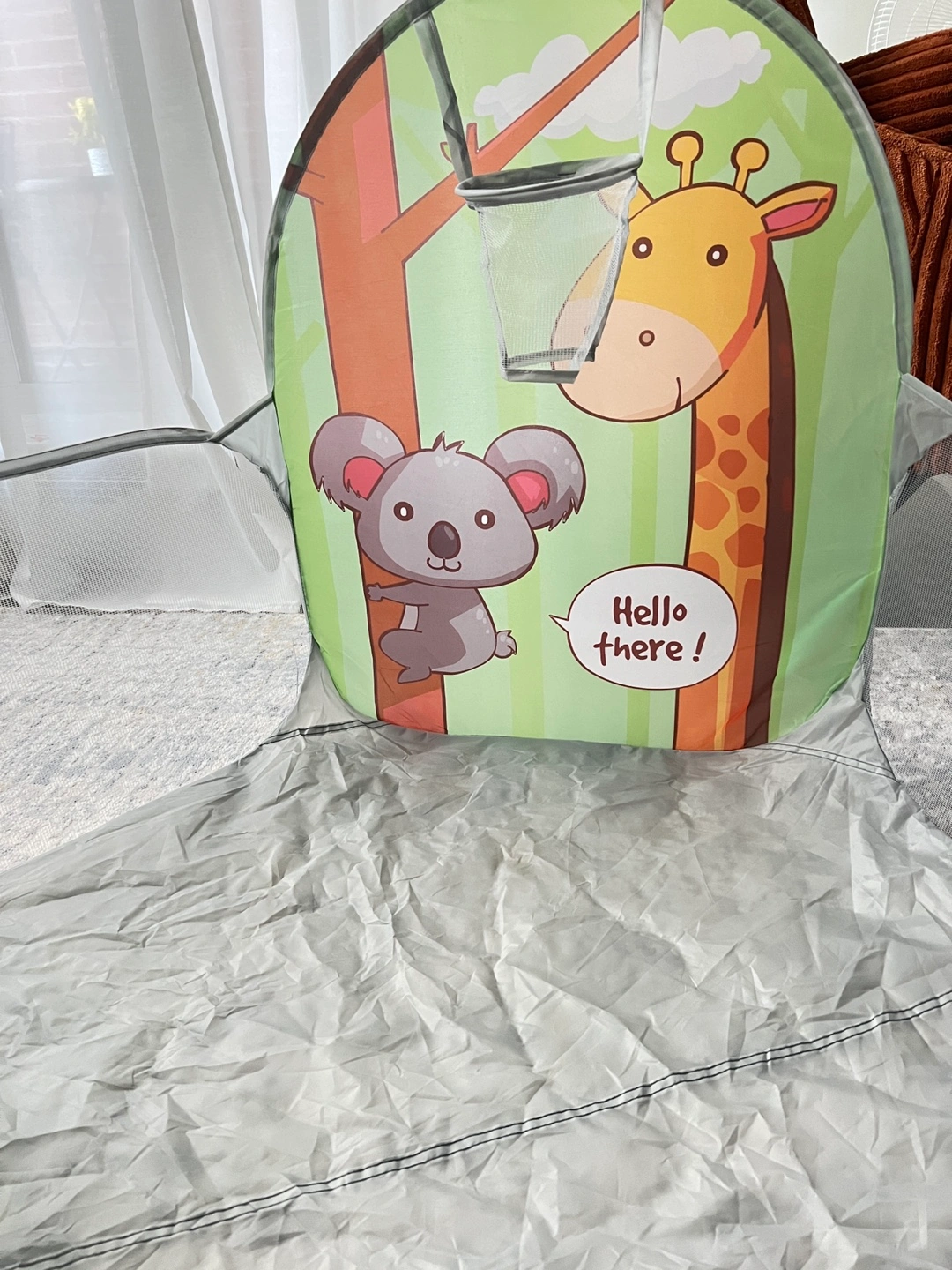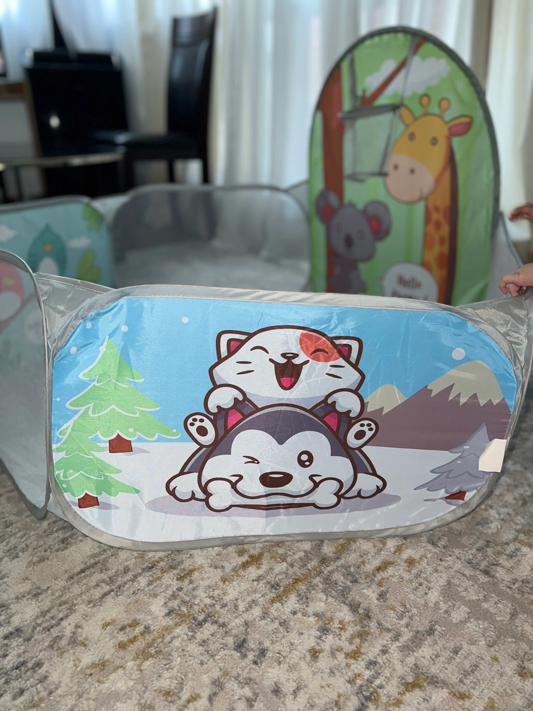 Here's a cute playpen for the little ones! It features a basketball hoop and fun animal designs. Perfect for keeping your kids entertained and safe while they play.(balls are not included)