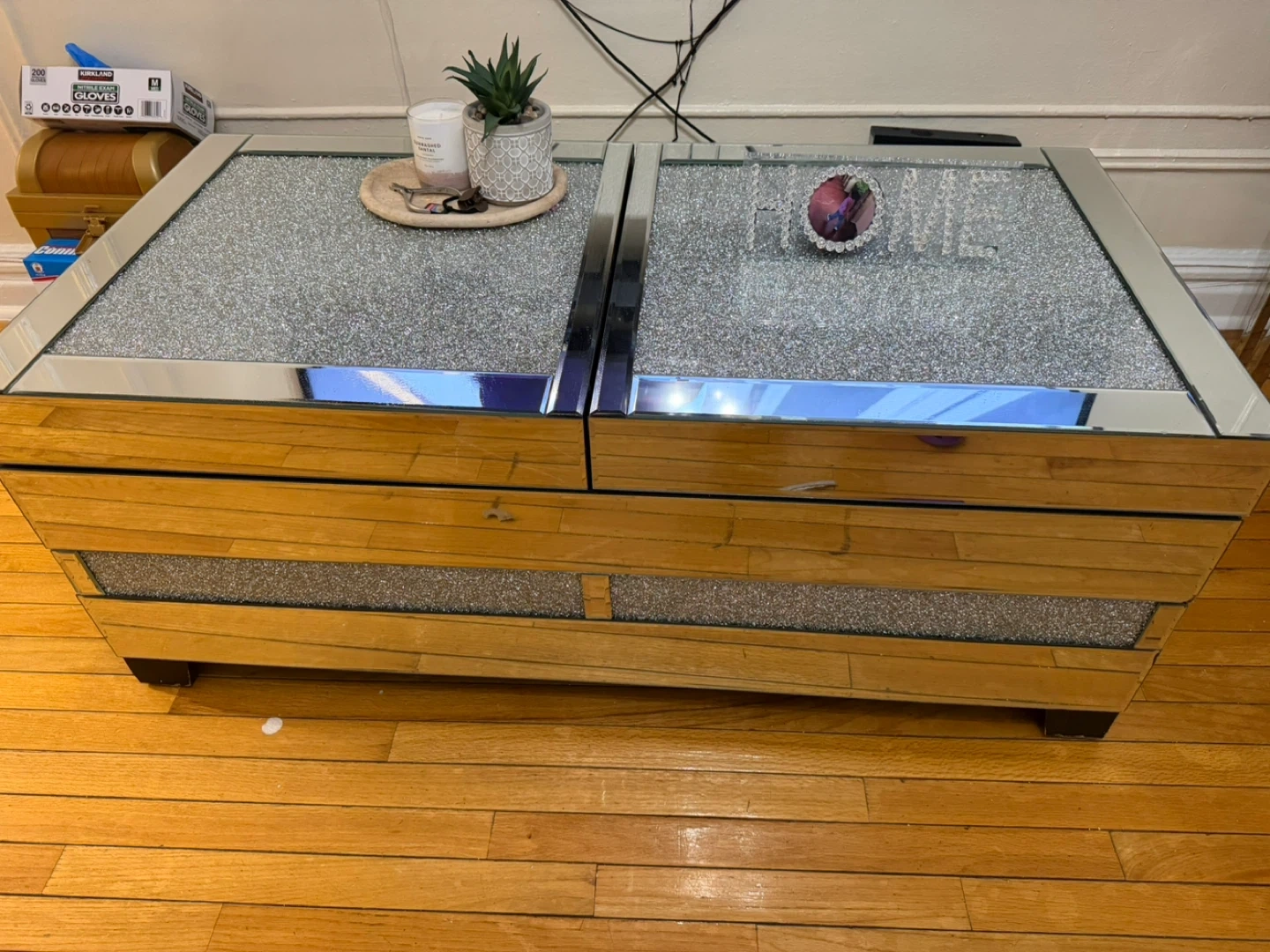 Glamorous mirrored coffee table with crushed diamond accents. It's a stylish centerpiece featuring a built-in bar for wine storage. Mirrored wood construction.