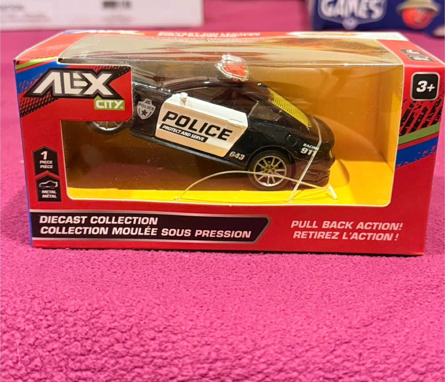 Pull back diecast police car. It's from the Diecast Collection line and features opening doors. Made of metal. New. 3+
