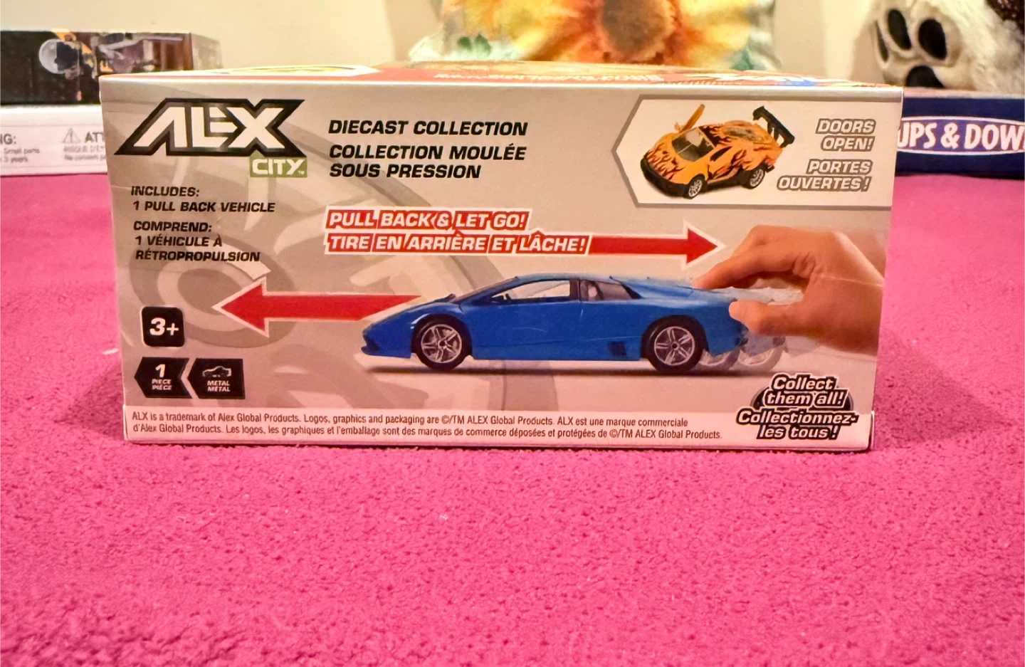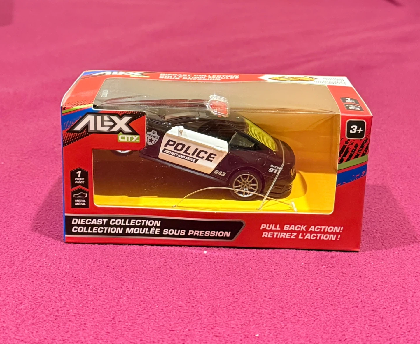 Pull back diecast police car. It's from the Diecast Collection line and features opening doors. Made of metal. New. 3+