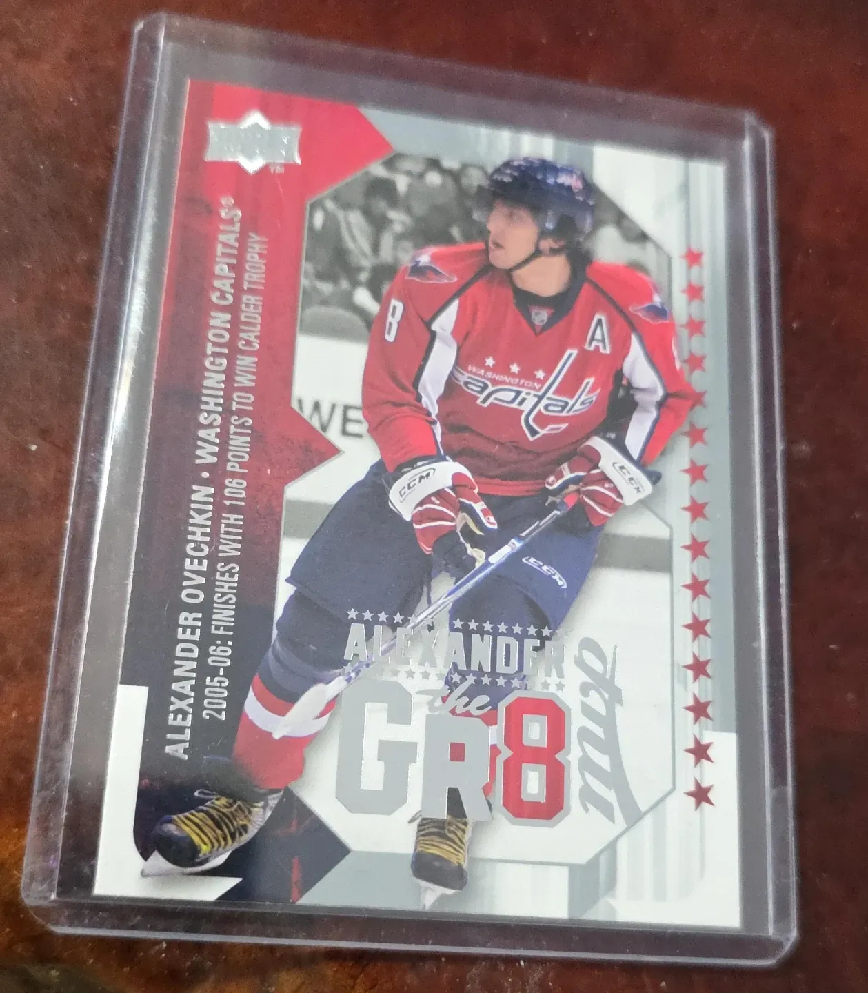 This is an Upper Deck hockey card featuring Alexander Ovechkin of the Washington Capitals. It commemorates his 2005-06 season where he finished with 106 points to win the Calder Trophy. The card also highlights his nickname 'The Gr8'.