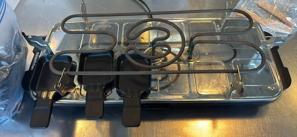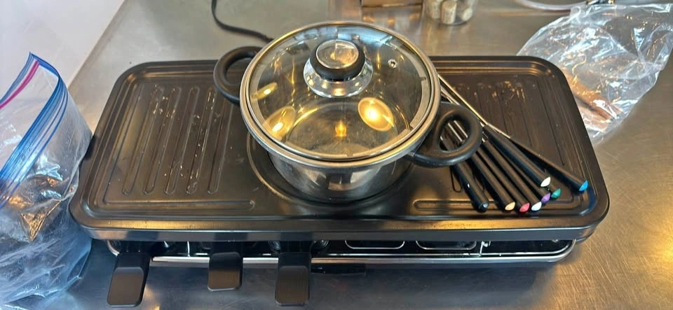 Well loved machine used for a Raclette dinner! Selling because we’re upgrading. Comes with 12 trays, fondue pot, fondue sticks, marble center stone and wooden scrapers. Purchased ~3 years ago for $100, asking $50 obo