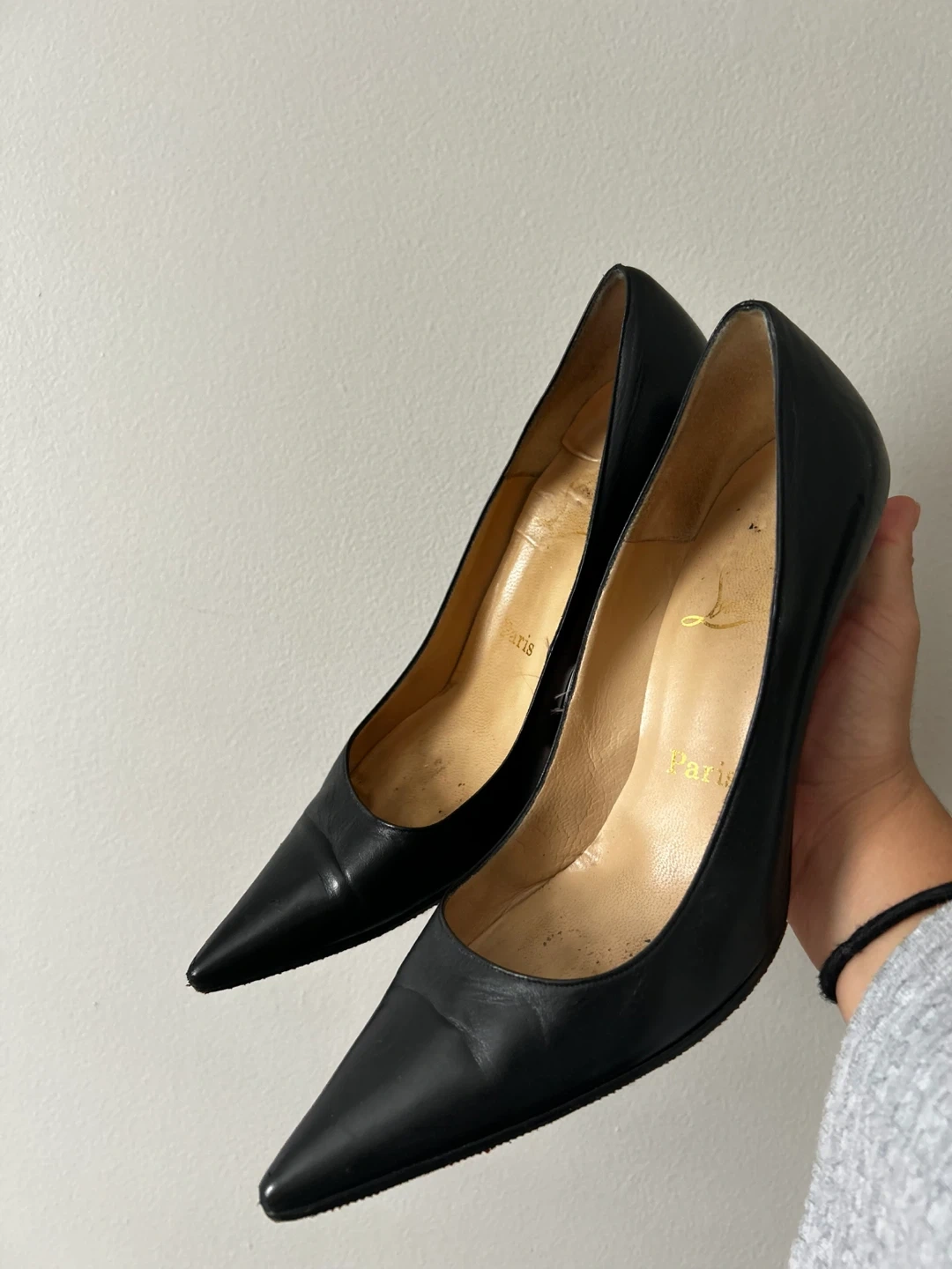 Selling a pair of Christian Louboutin black heels. They show some signs of wear, but the iconic red soles are still in great shape. Perfect for adding a touch of luxury to your wardrobe!