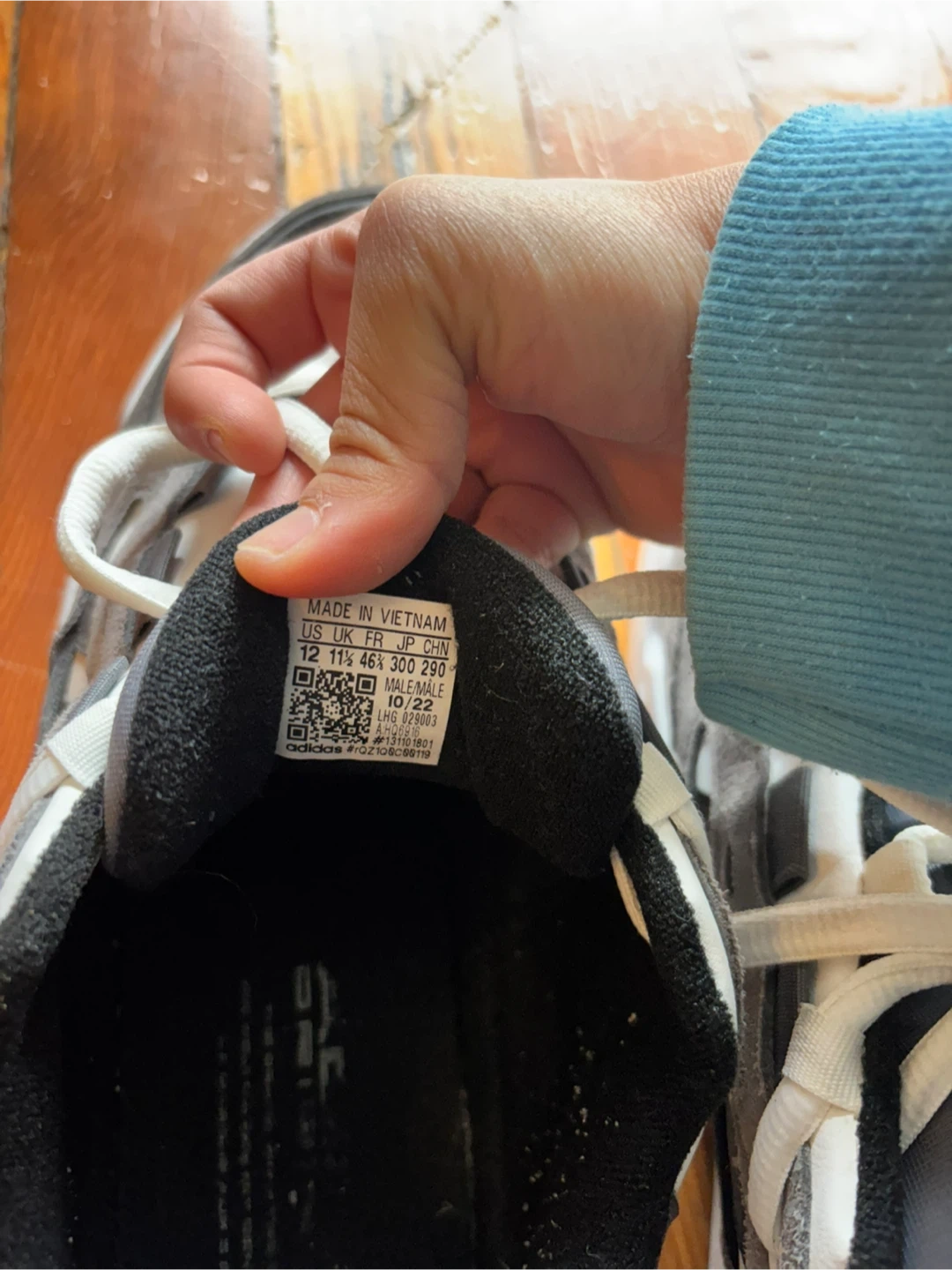 Adidas sneakers in a grey, white, and black colourway. US Men's size 12 (UK 11.5, EU 46, CM 30). Made in Vietnam. These shoes are great for everyday wear.