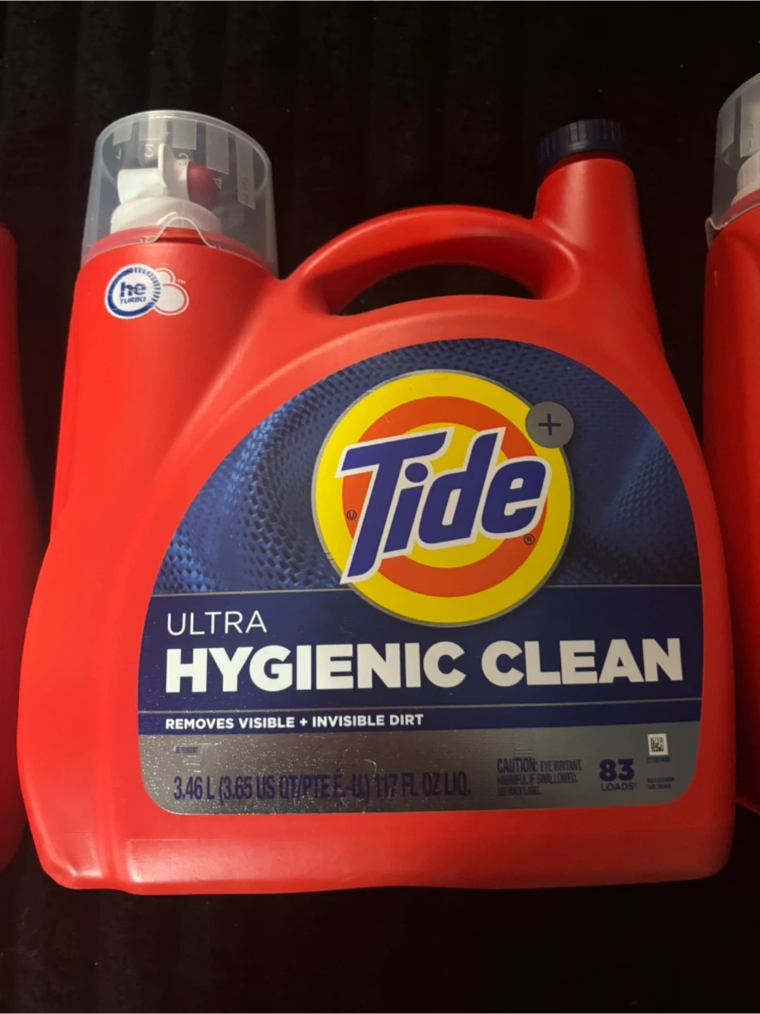This is a bottle of Tide Ultra Hygienic Clean liquid laundry detergent. It's 3.46 L (3.65 US QT) and provides 83 loads. It removes visible and invisible dirt.