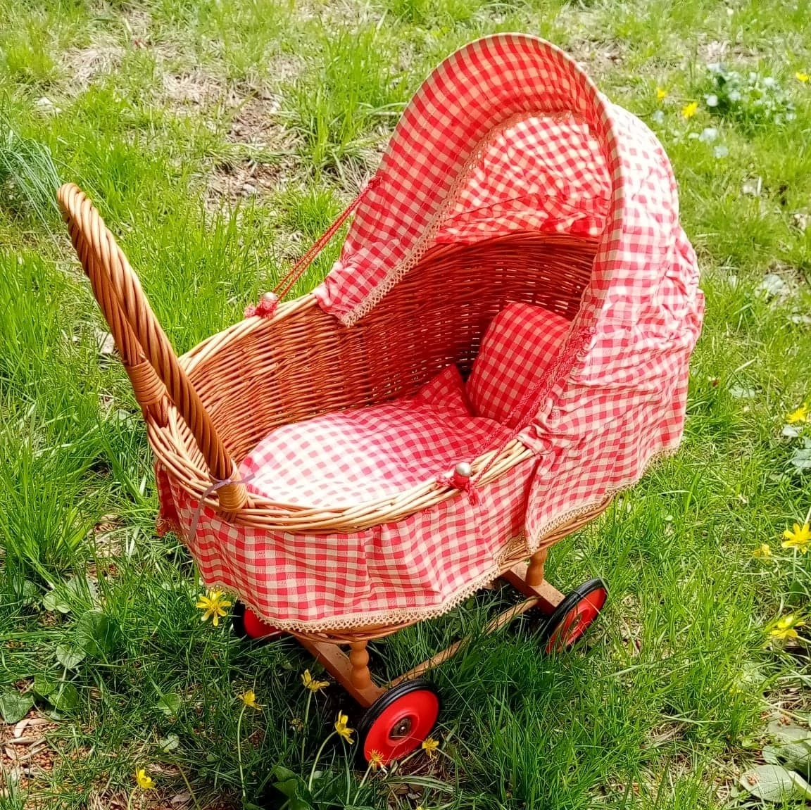 This antique wicker baby doll bassinet buggy carriage stroller is a stylish and charming collectible item for those who appreciate vintage baby nursery decor. Made from wood, rattan, and metal, this stroller features red wheels and a checkerboard design in red and white. Perfect for displaying a baby doll or as a decorative piece in a nursery or playroom, this unique item adds a touch of nostalgia and whimsy to any space.
