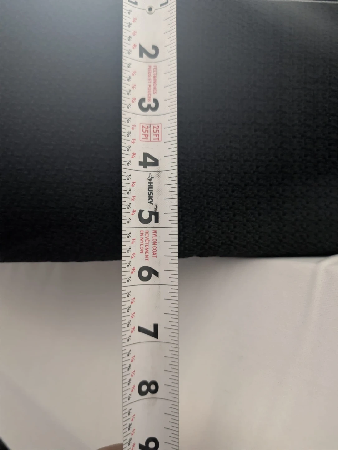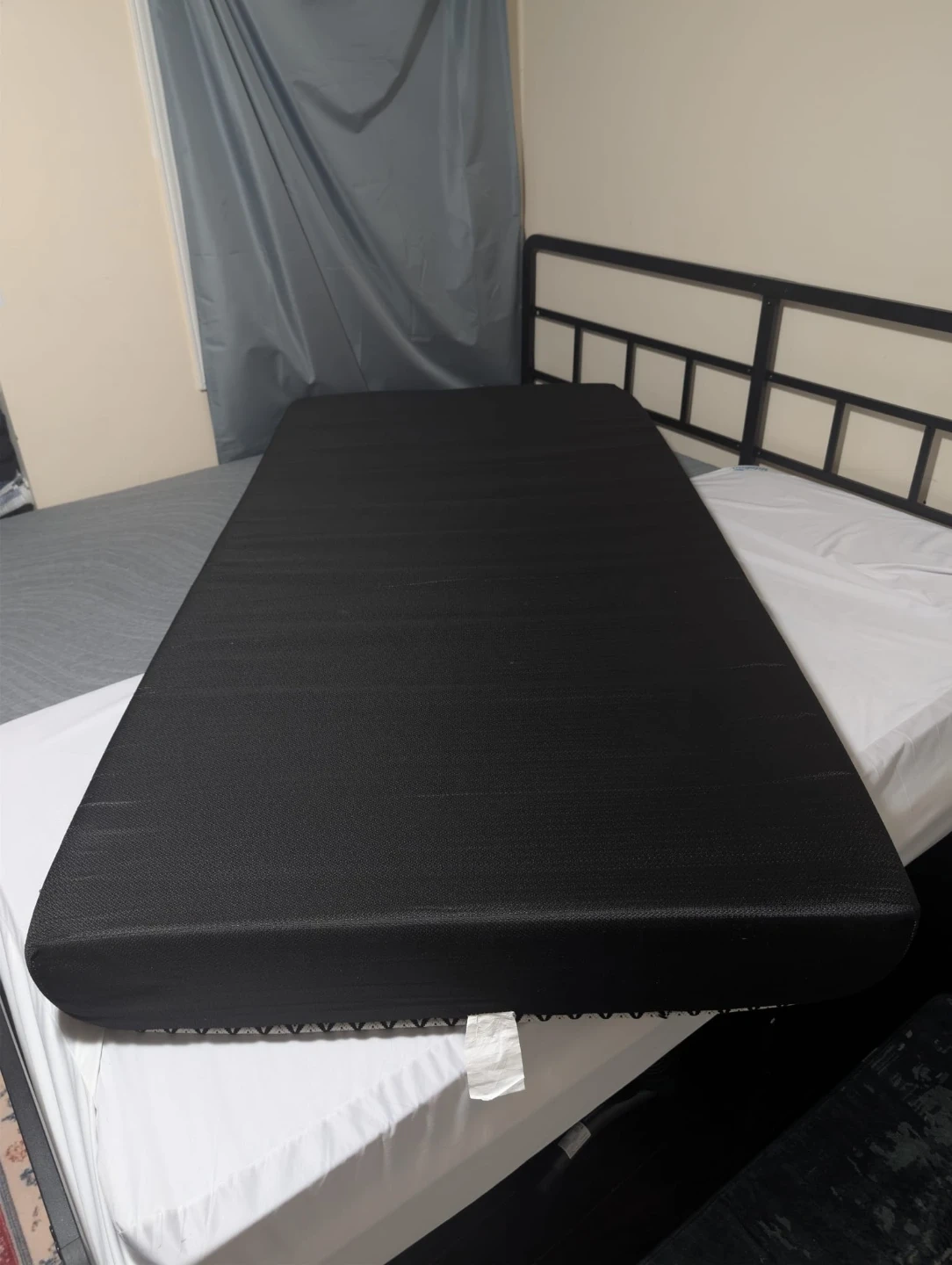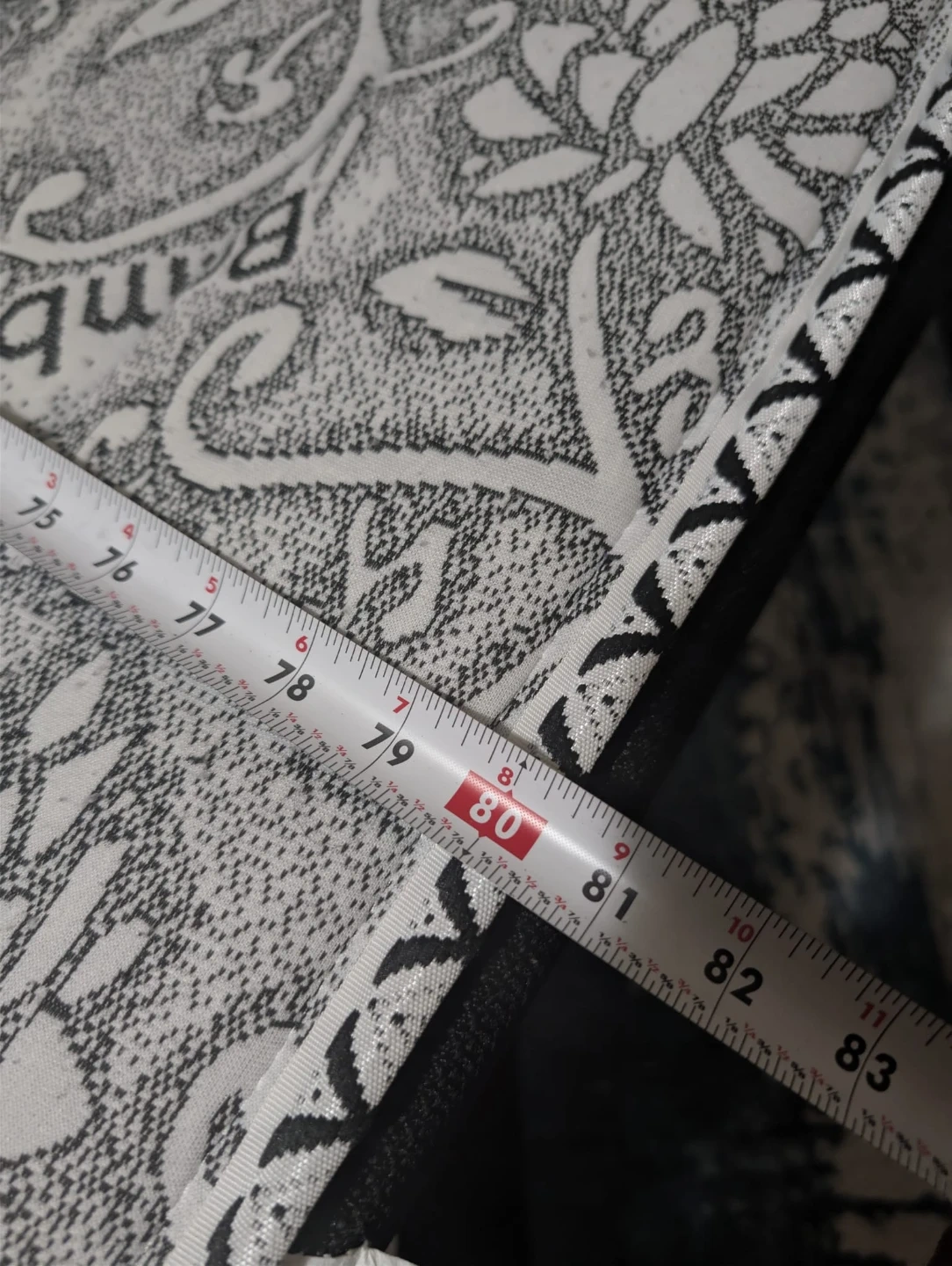 Black woven mattress with a white floral pattern on one side. Measures approximately 80 inches long and 38 inches wide. Height is about 6 inches.