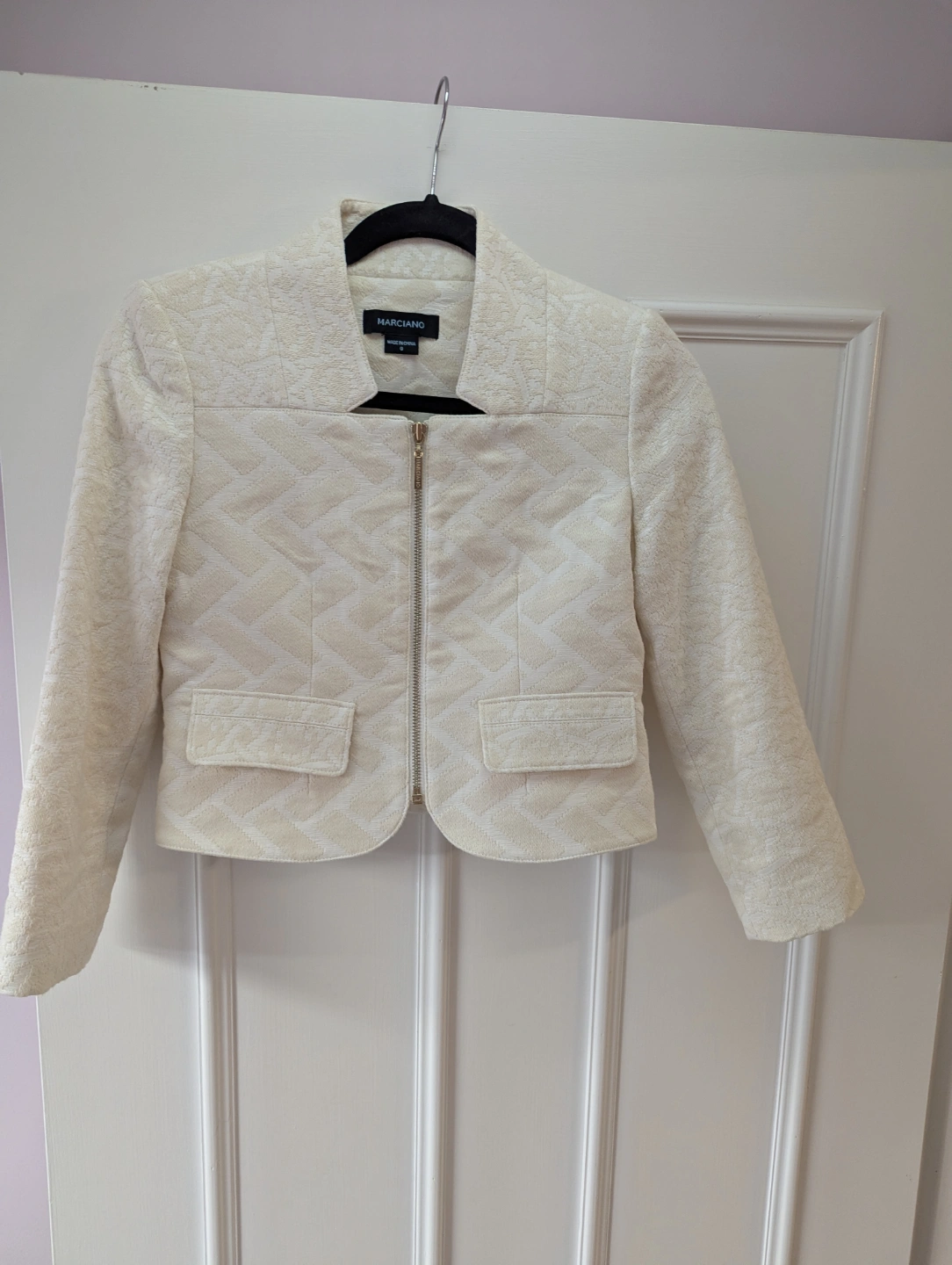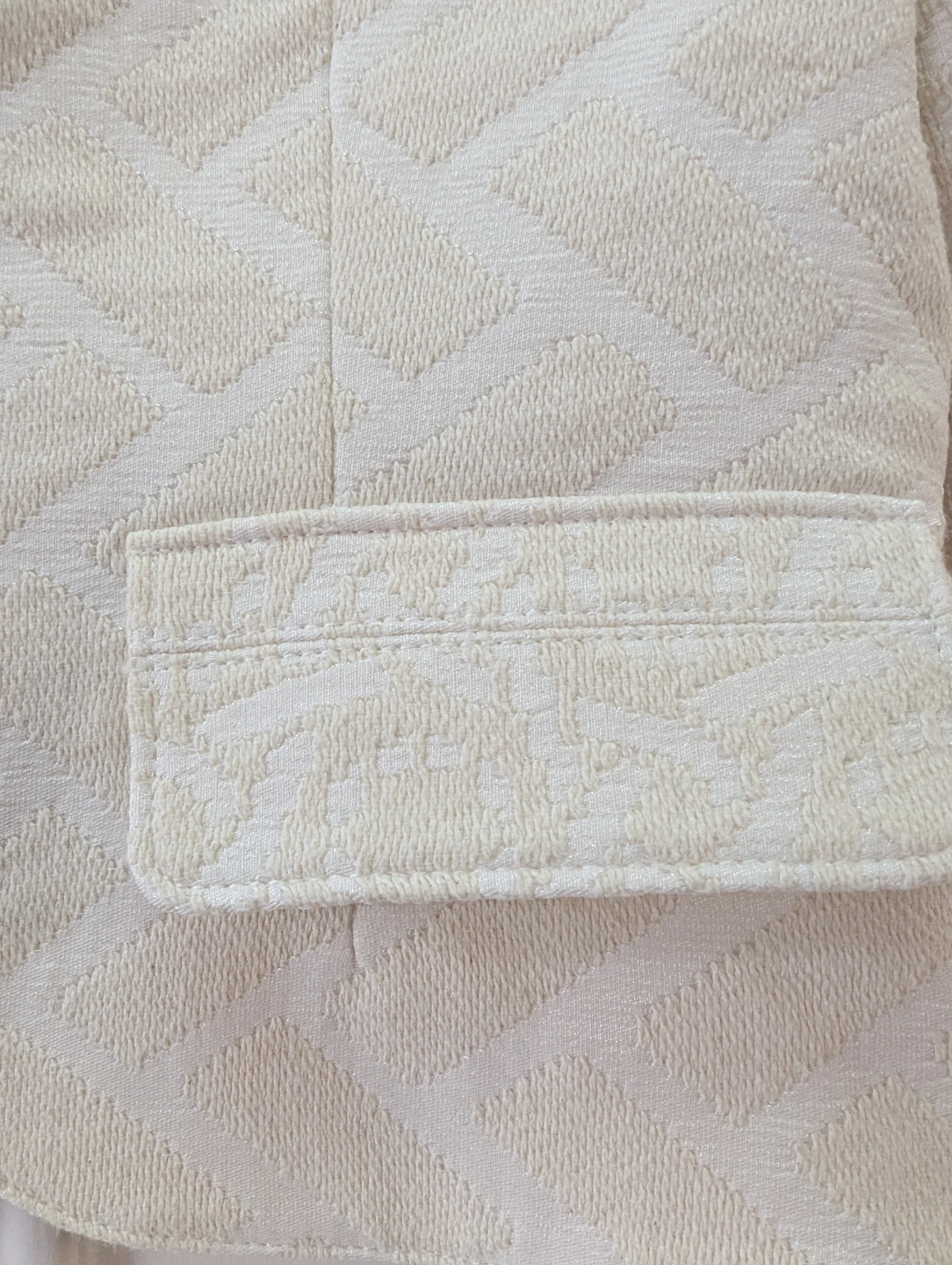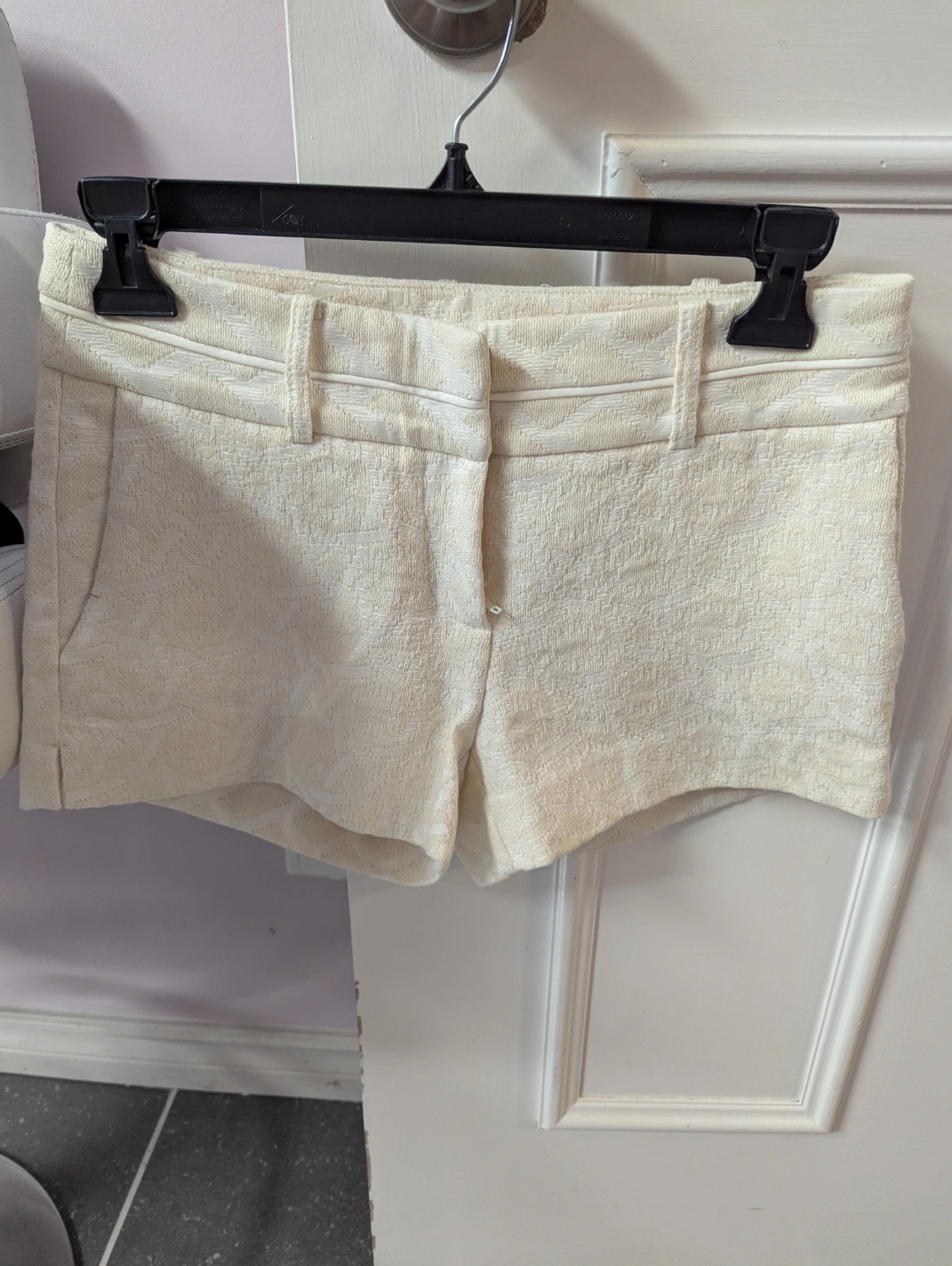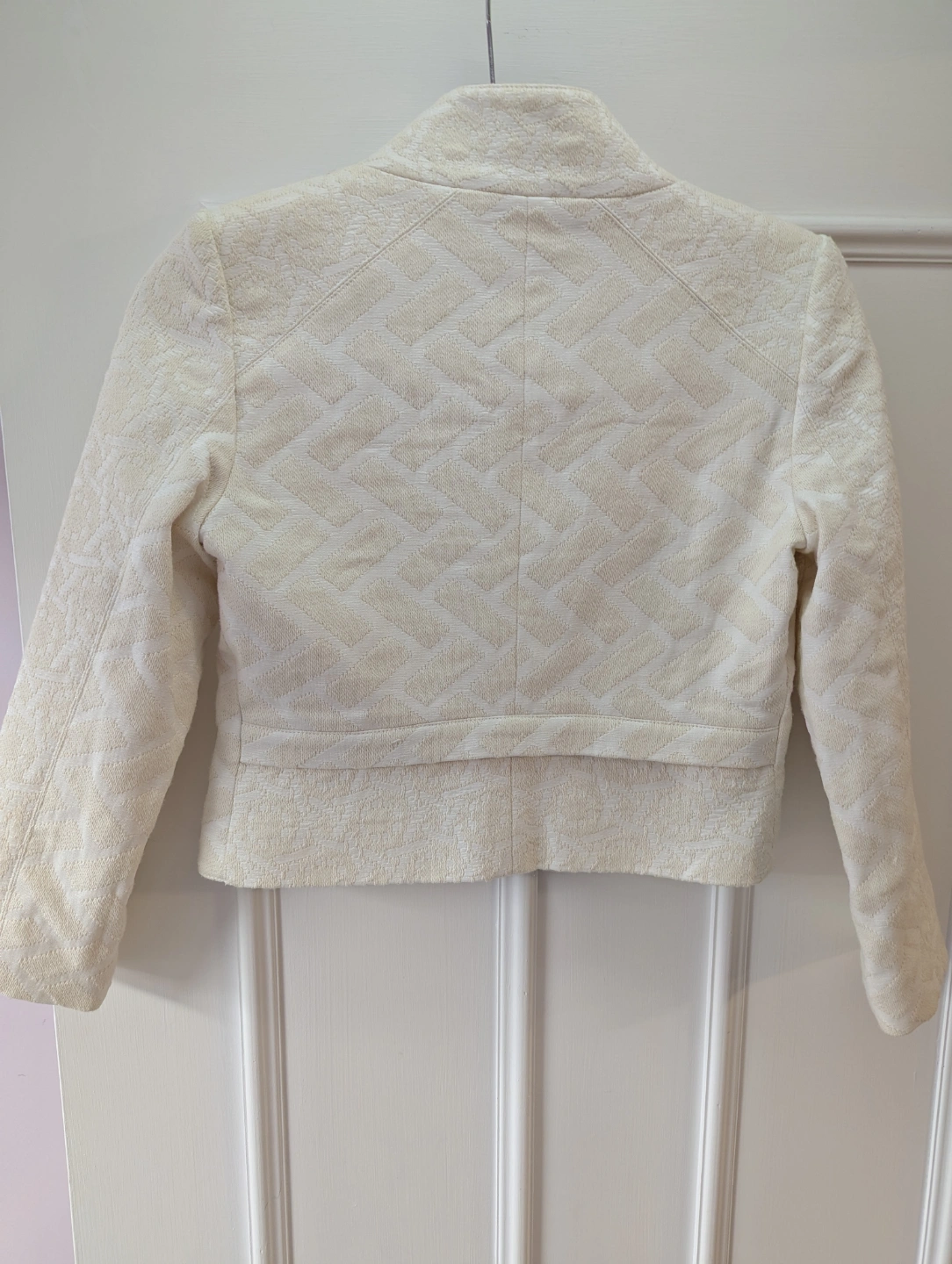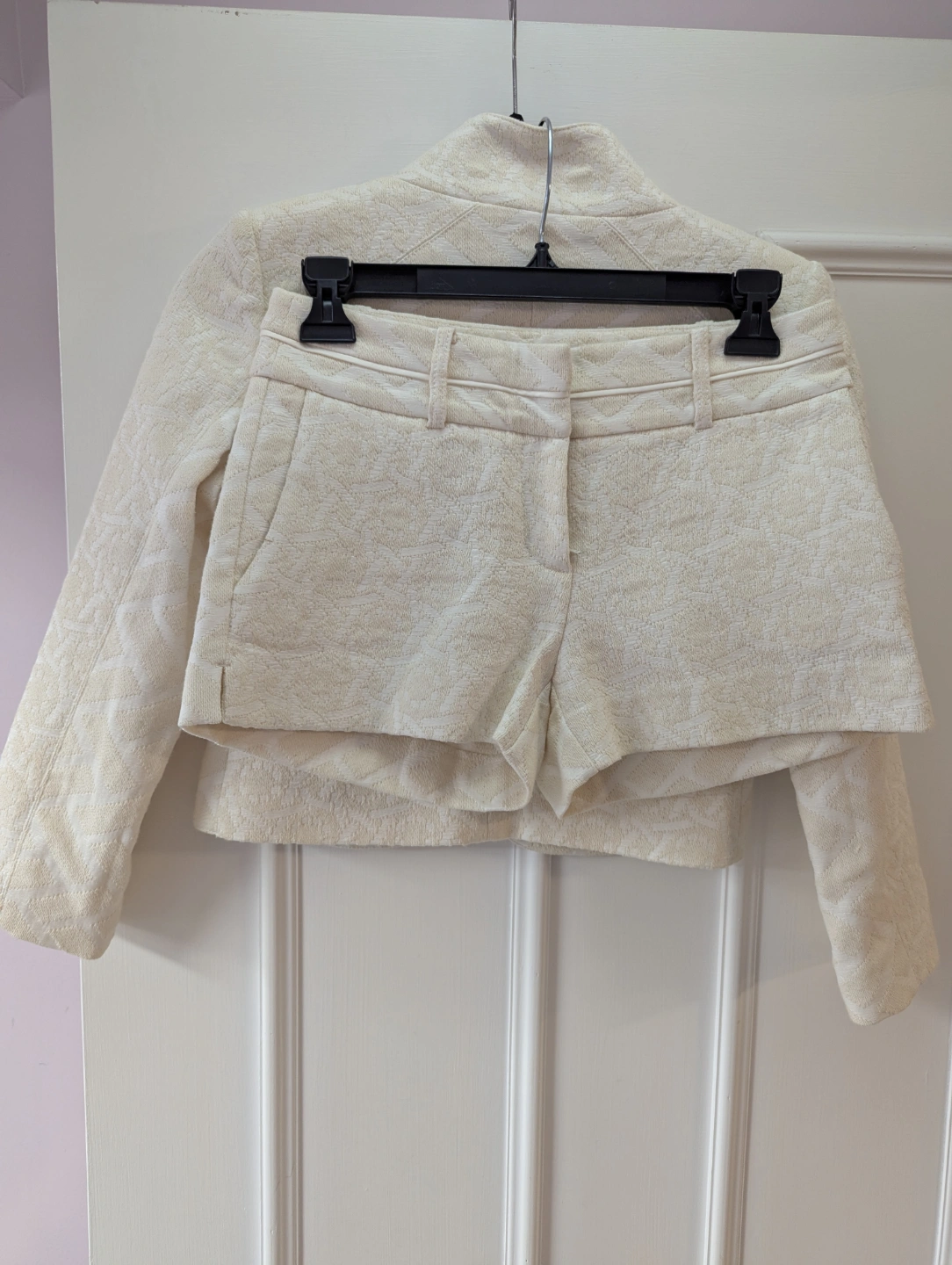 Cream-coloured, textured, zip-up jacket and shorts set. Size 0. Made in China.